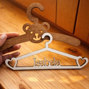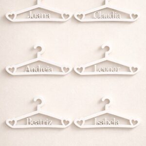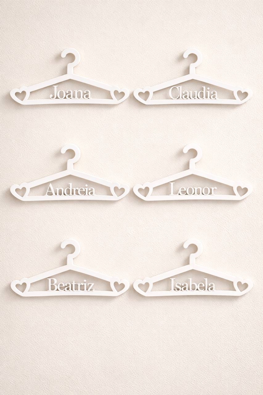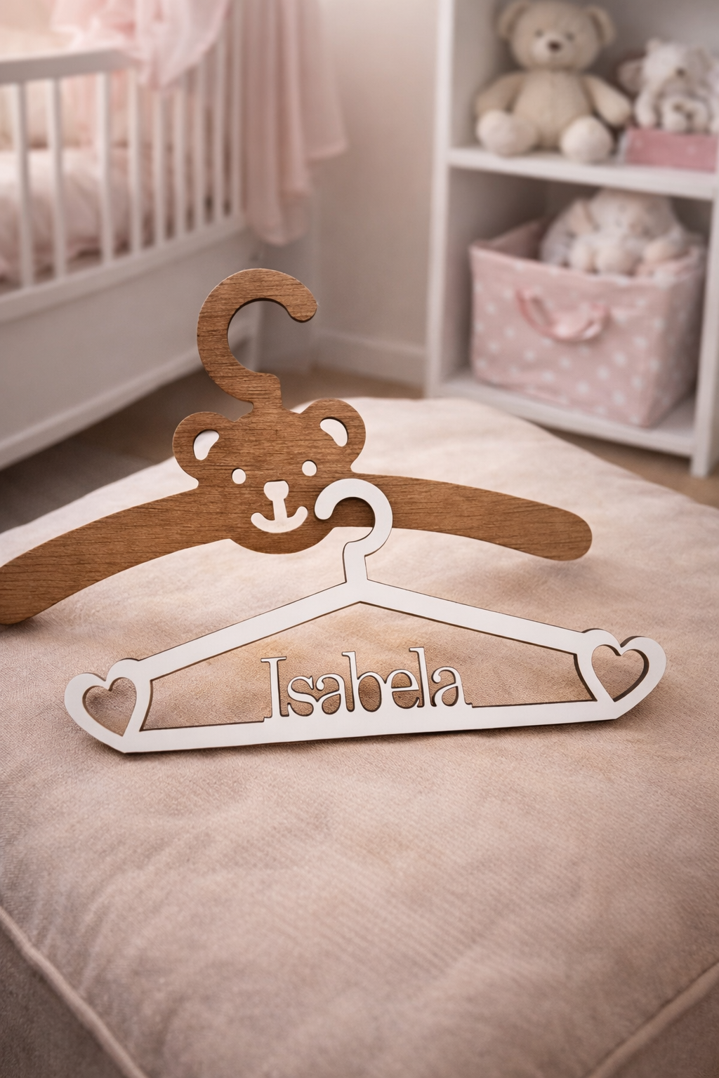 Para organizar as roupas do bebé. Cabides em madeiras personalizados com o nome do bebé O conjunto vem com 5 cabides + 1 cabide personalizado.