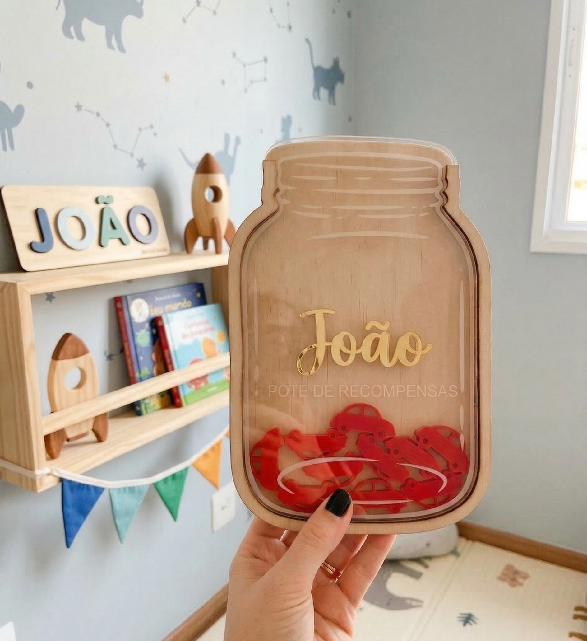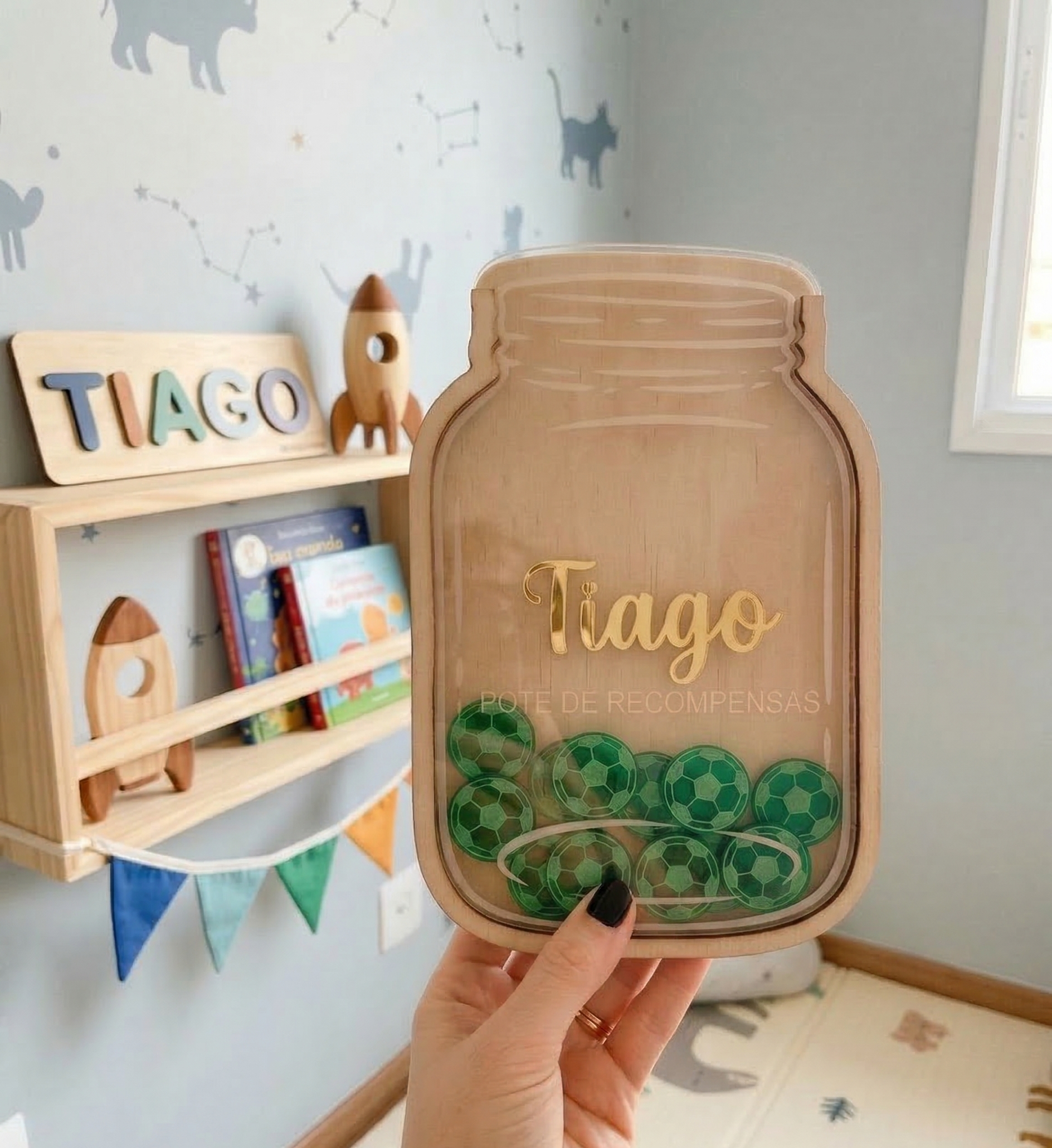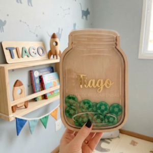 O Pote de Recompensas personalizado ajuda as crianças a acompanhar as suas conquistas através de peças que vão sendo adicionadas sempre que completam tarefas ou atingem objetivos.