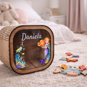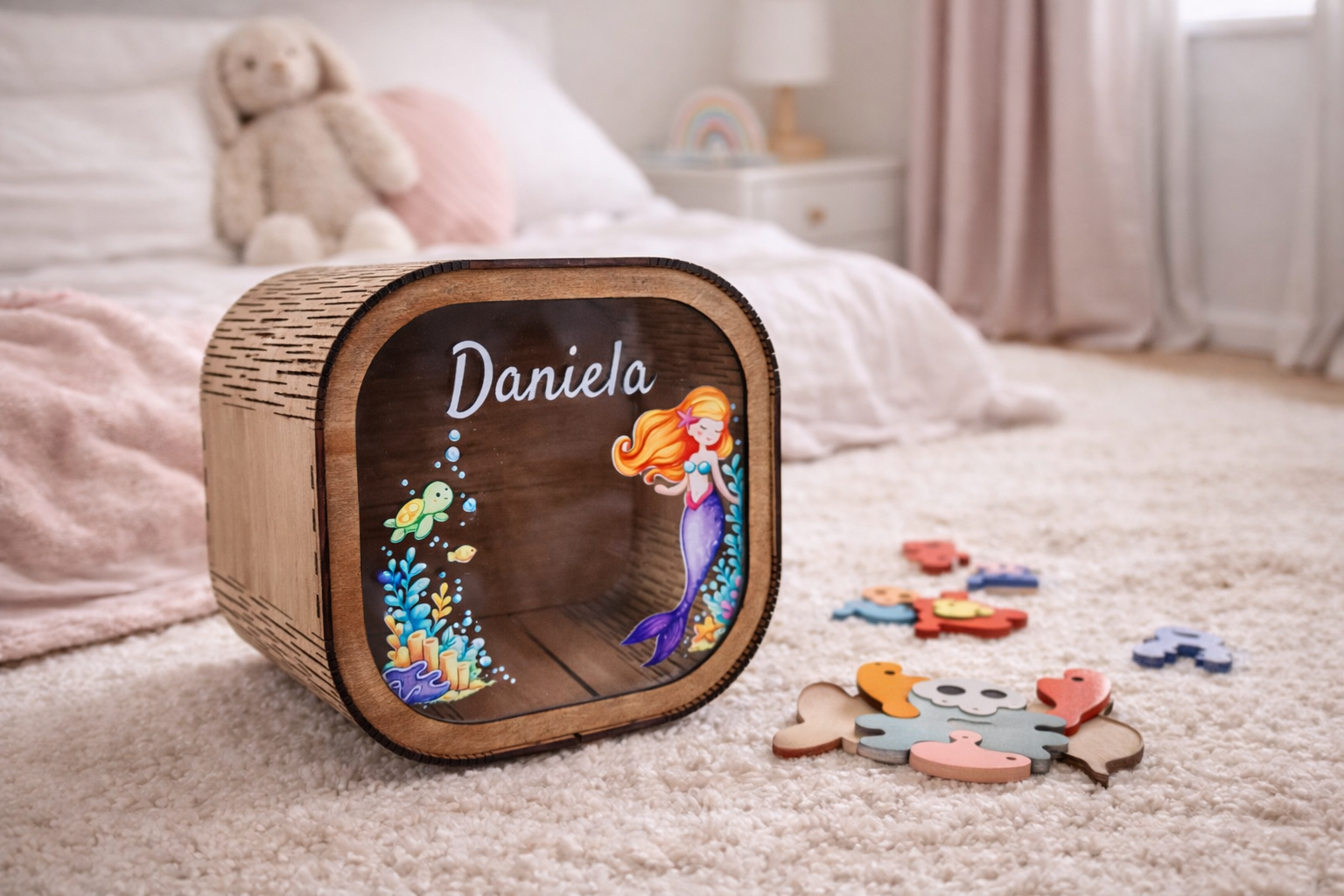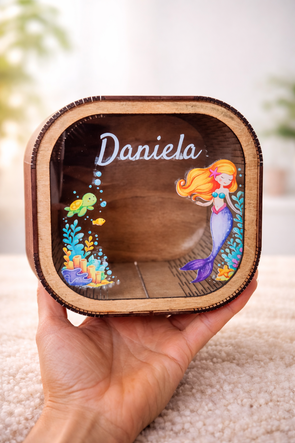 🪵 Material: madeira bétula e acrílico com design da pequena sereia