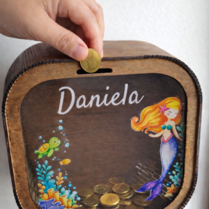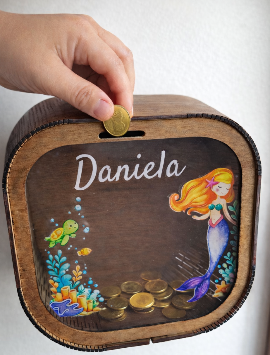 Mealheiro original personalizado com o nome da criança, perfeito para incentivar os mais pequenos a aprender o valor de poupar de forma divertida.