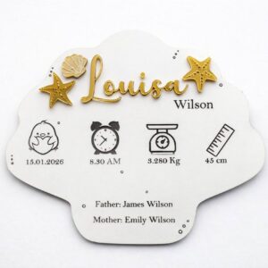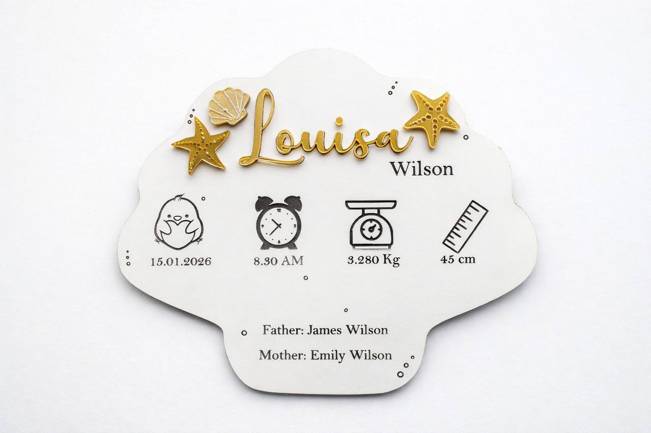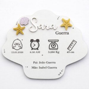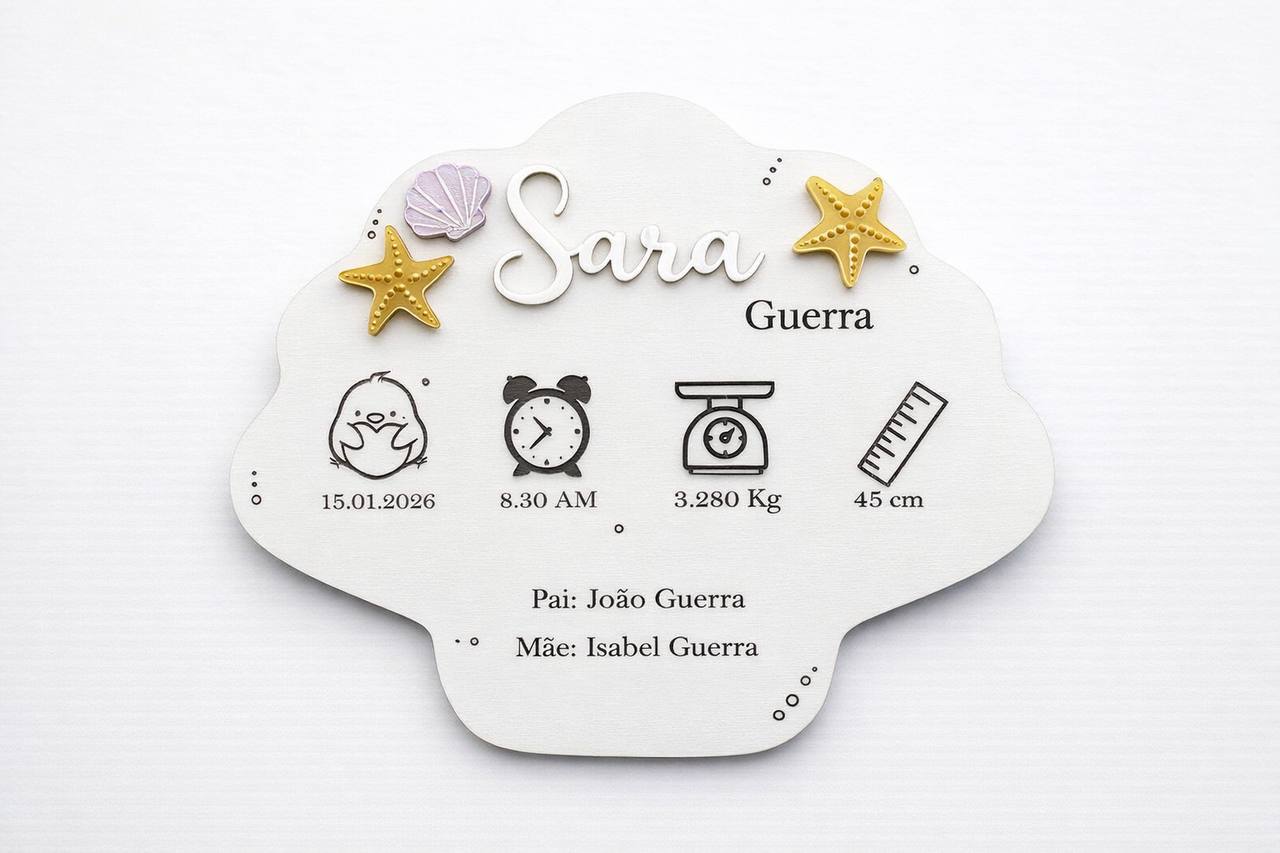 Conteúdo: Placa de madeira branca em forma de concha, gancho traseiro