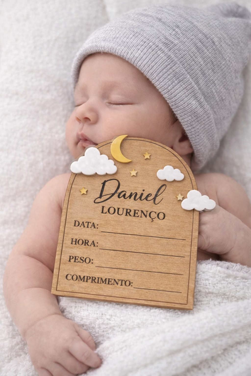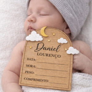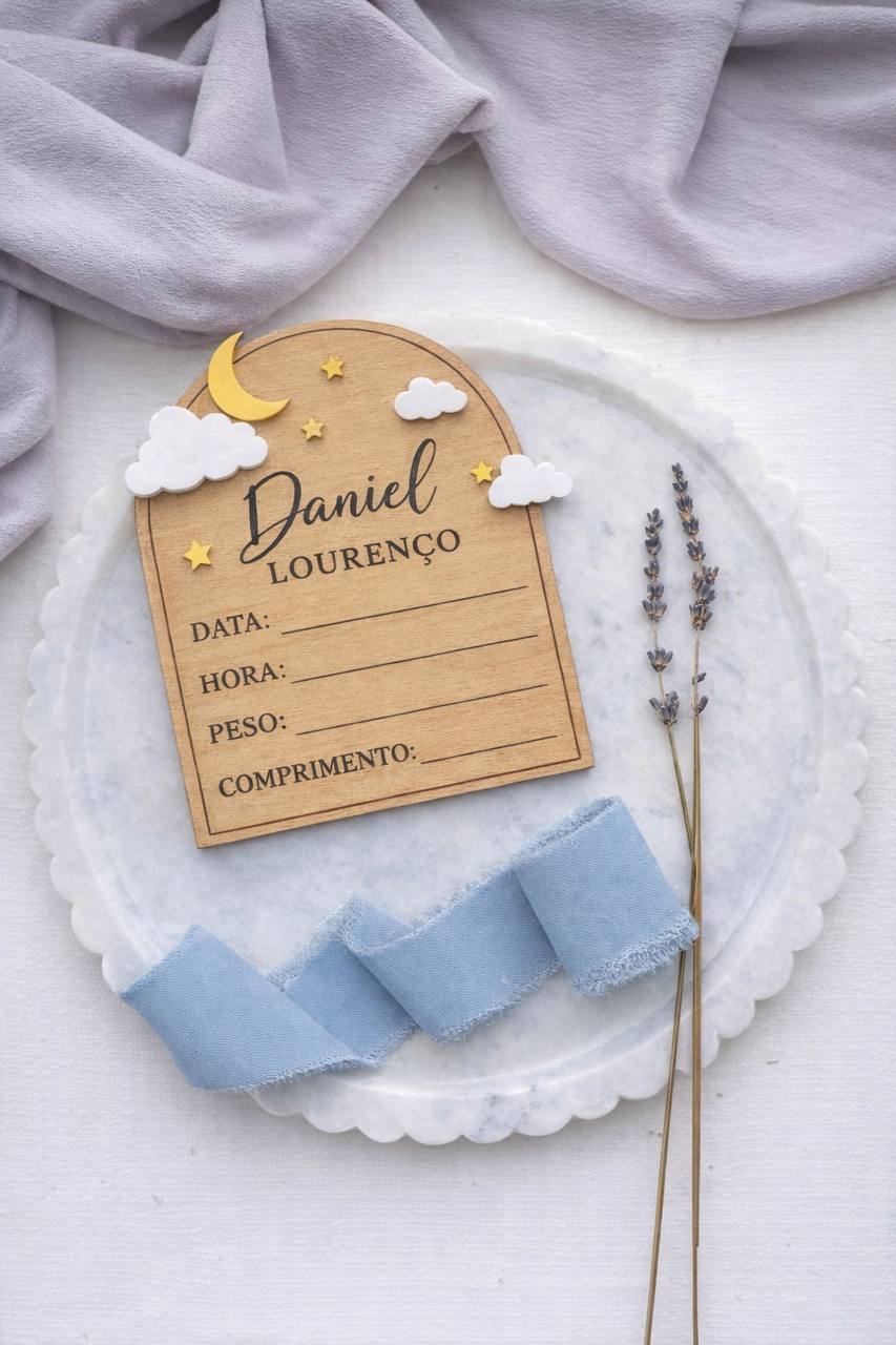 Conteúdo: Placa de madeira com nuvens e estrelas, gancho traseiro