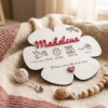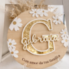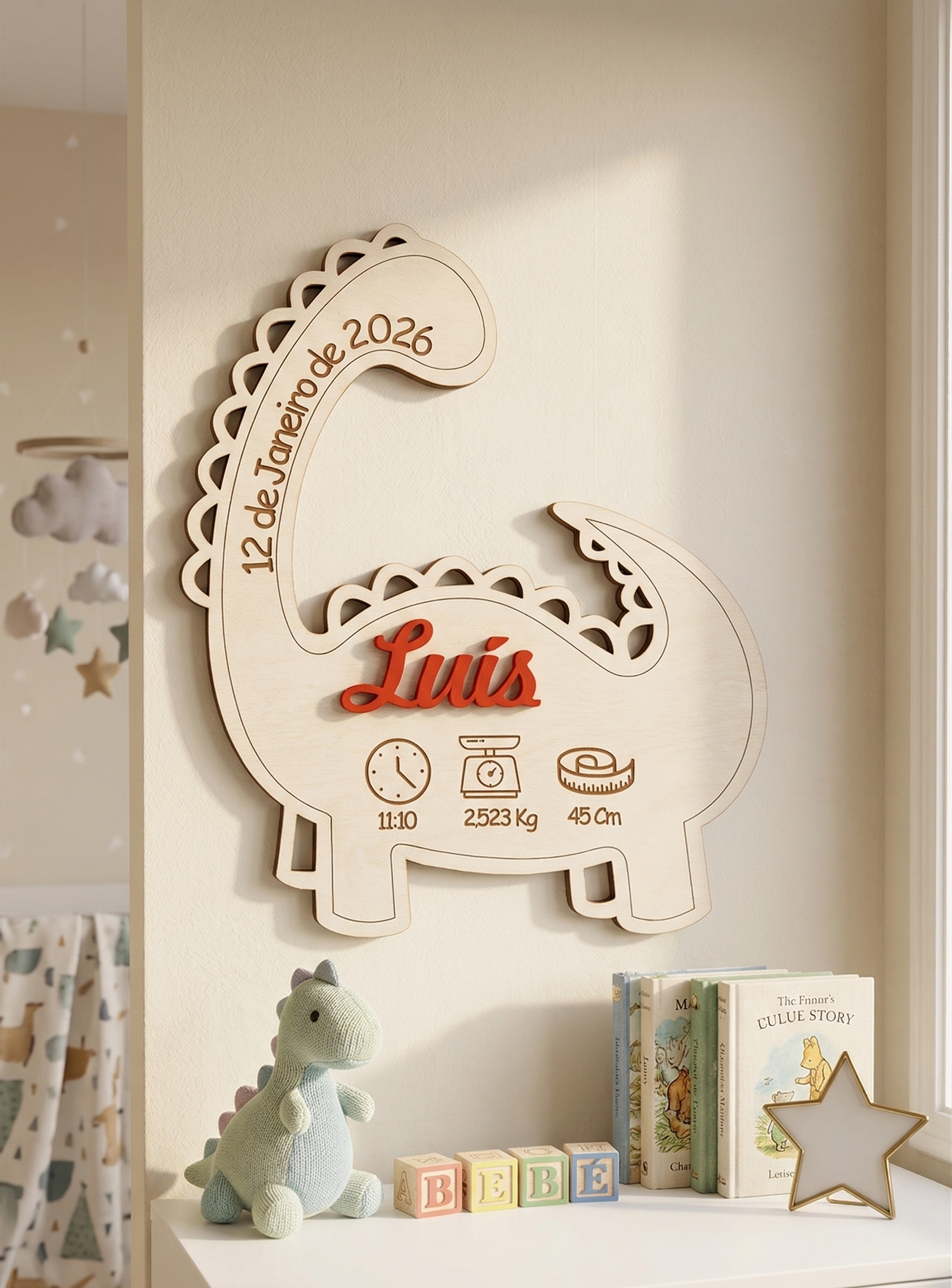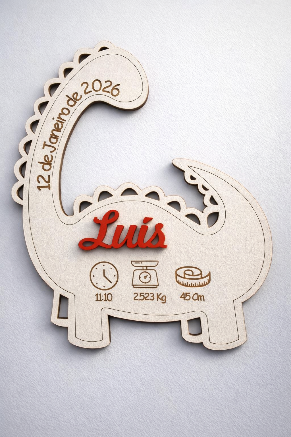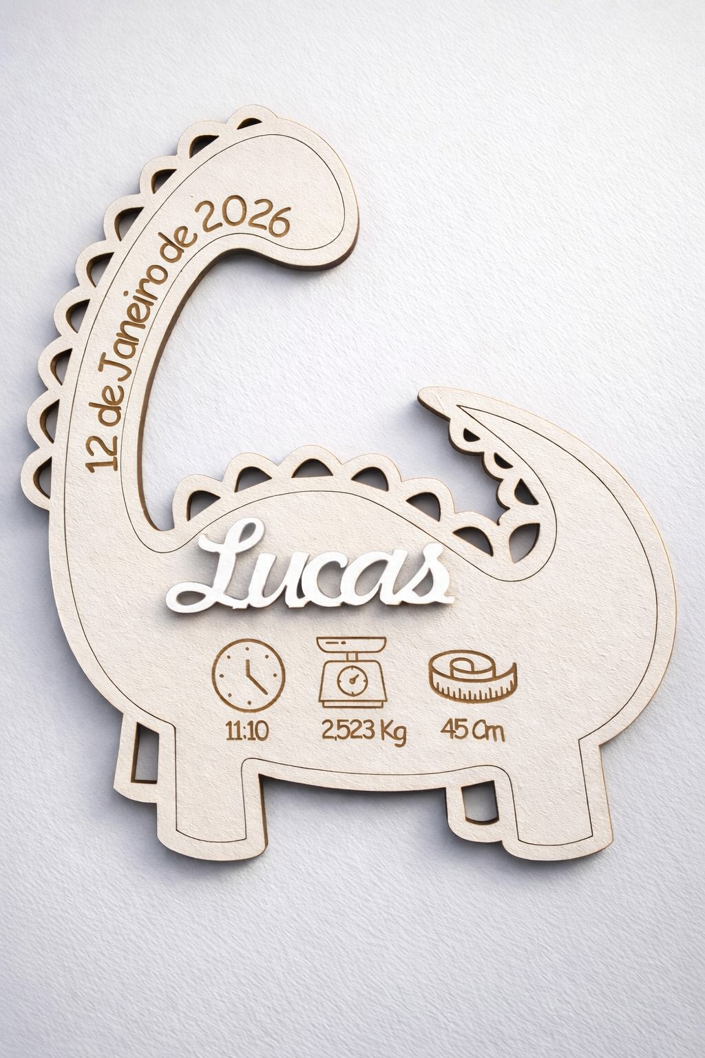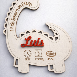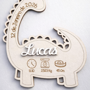 Conteúdo: Placa de madeira branca em forma de dinossauro, gancho traseiro