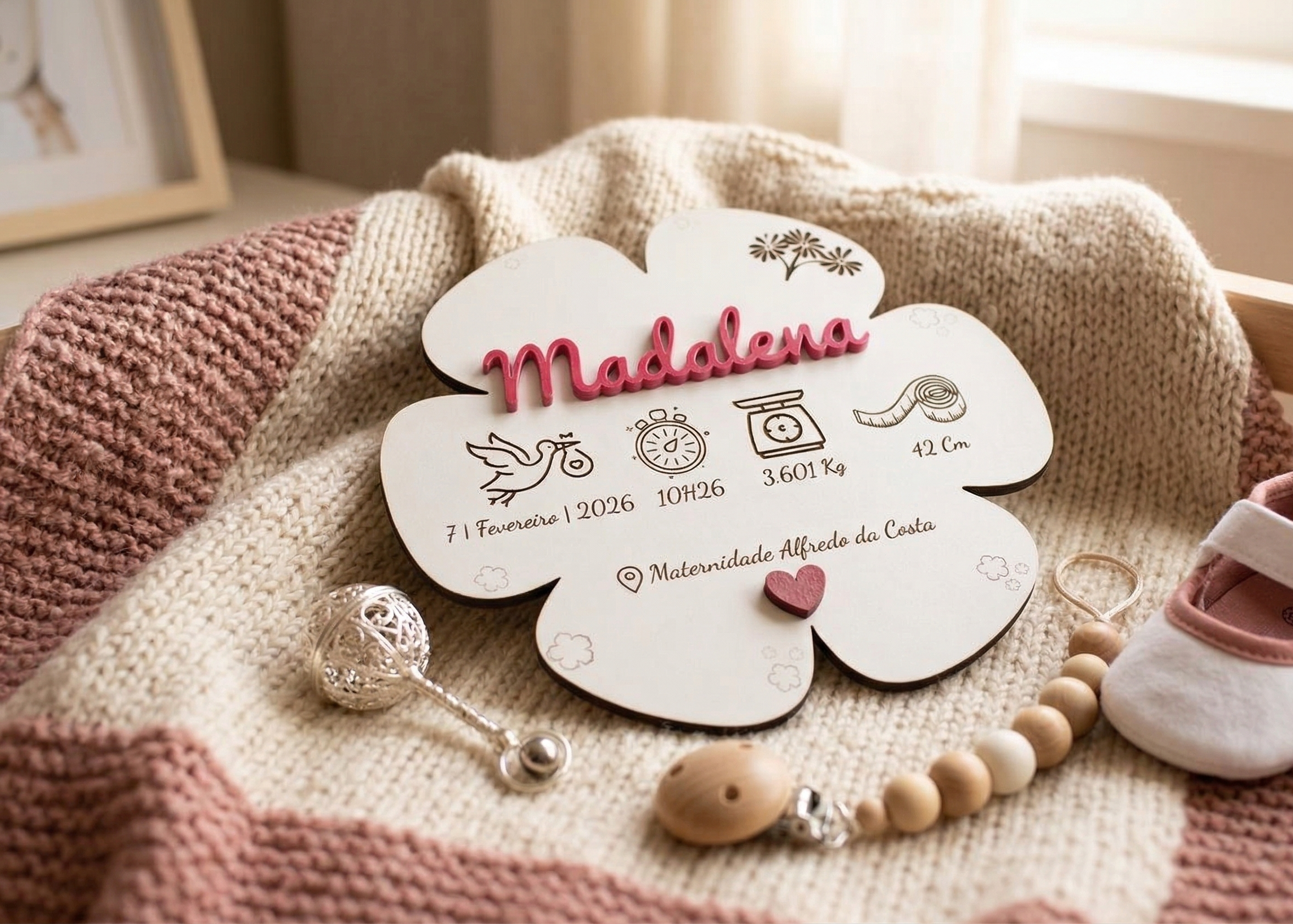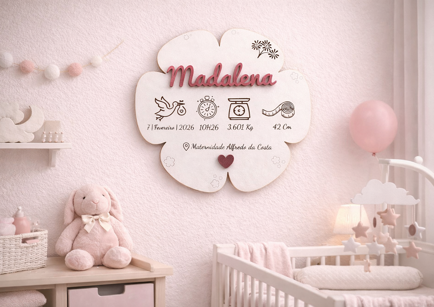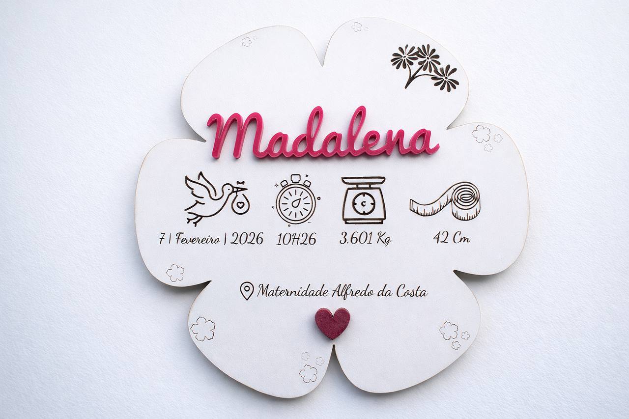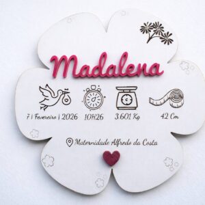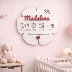 Conteúdo: Placa de madeira branca em forma de Flor, gancho traseiro