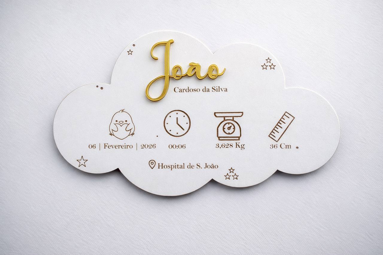 Conteúdo: Placa de madeira branca em forma de nuvem, gancho traseiro