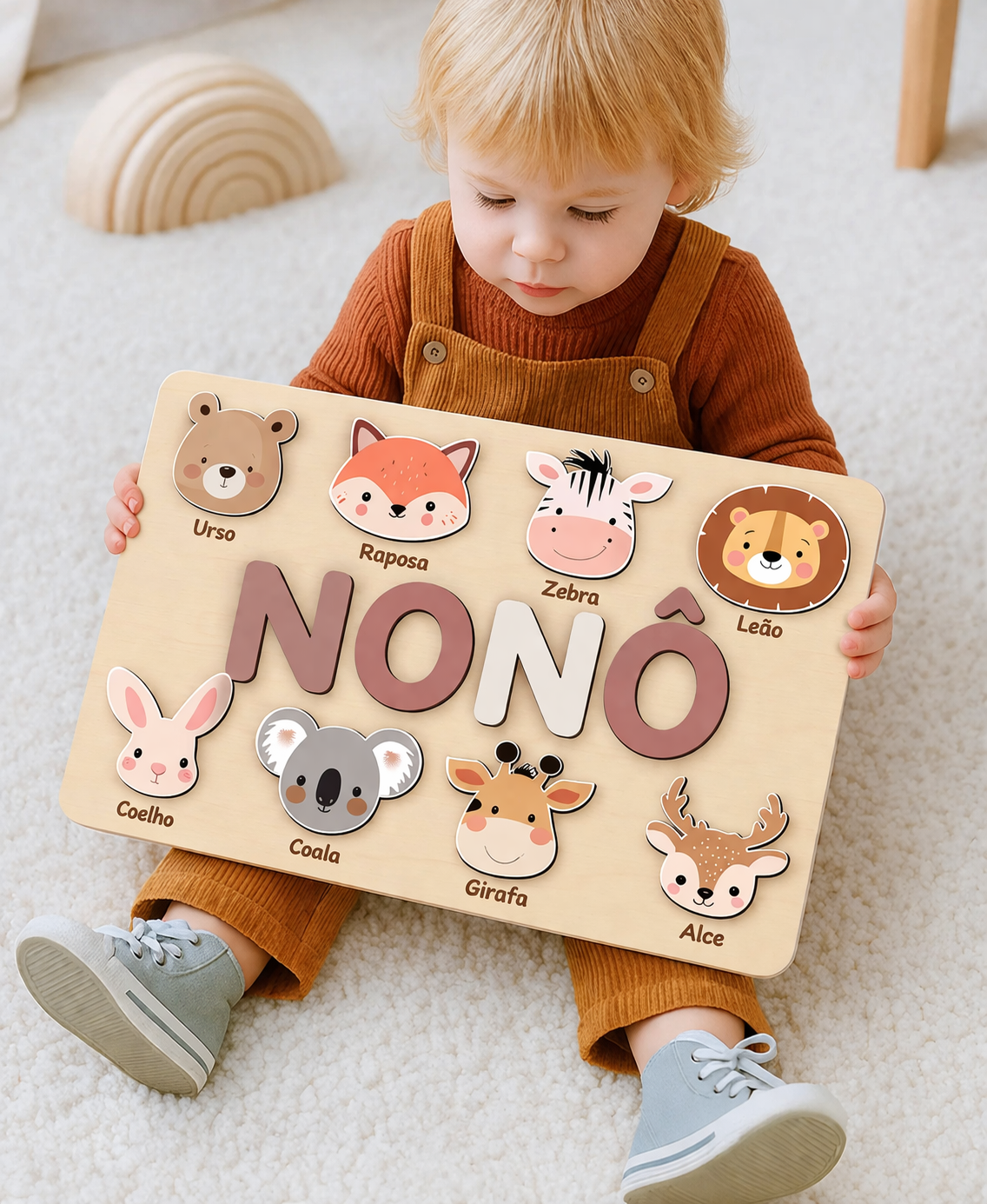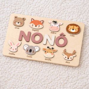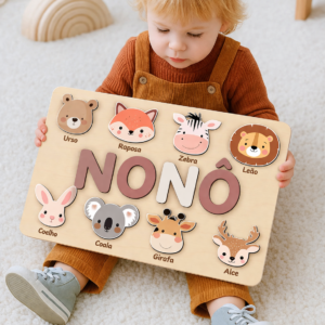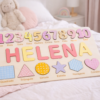 Este puzzle personalizado com nome com cores suaves e acabamento em madeira bétula.