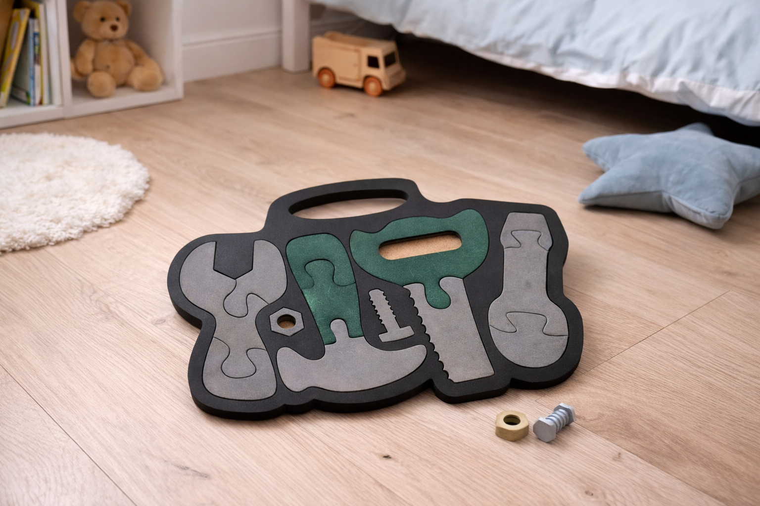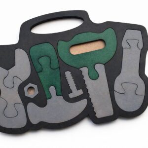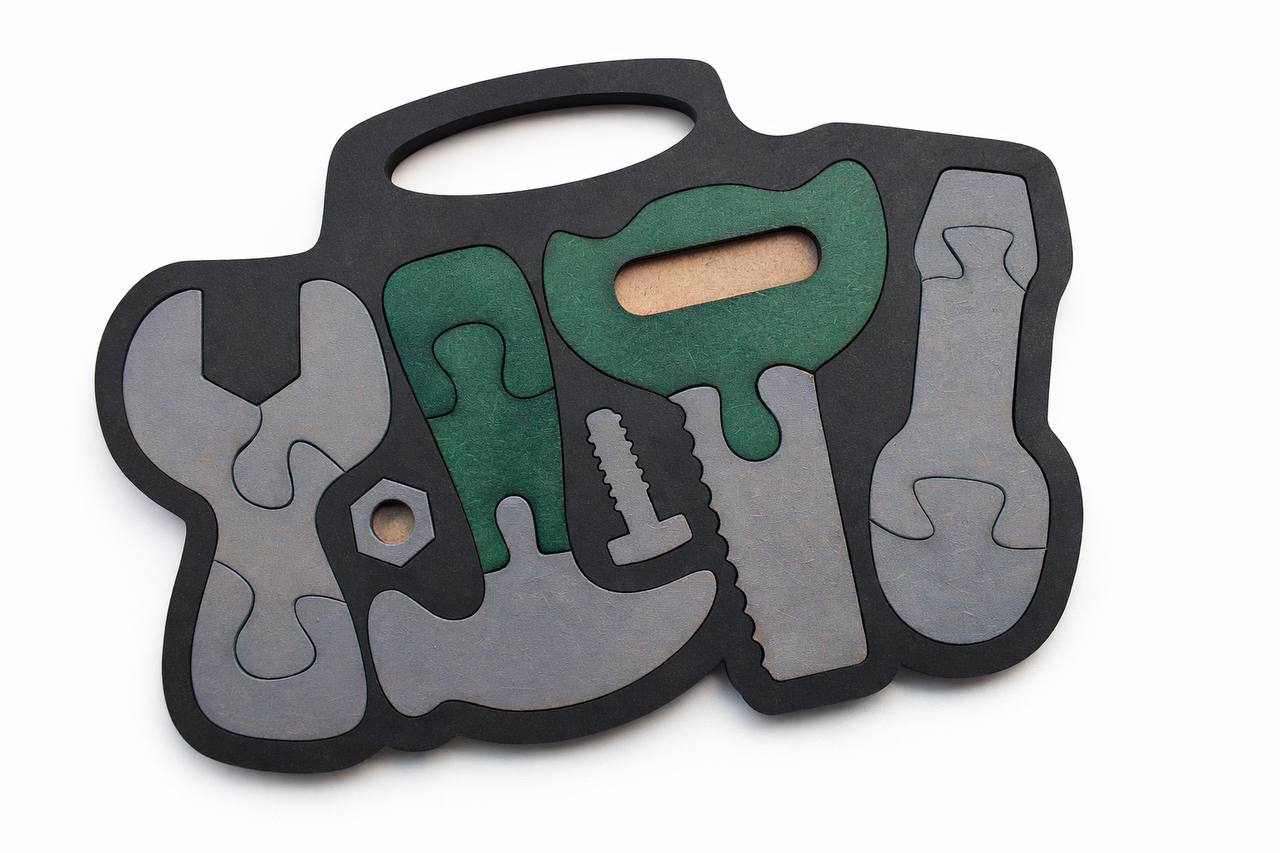 Puzzle em madeira com ferramentas ajuda a melhorar a coordenação motora, o reconhecimento de formas e a concentração, sem estímulos excessivos ou distrações.