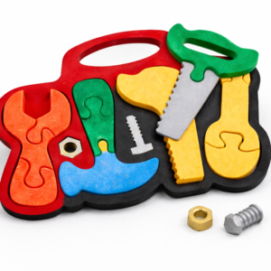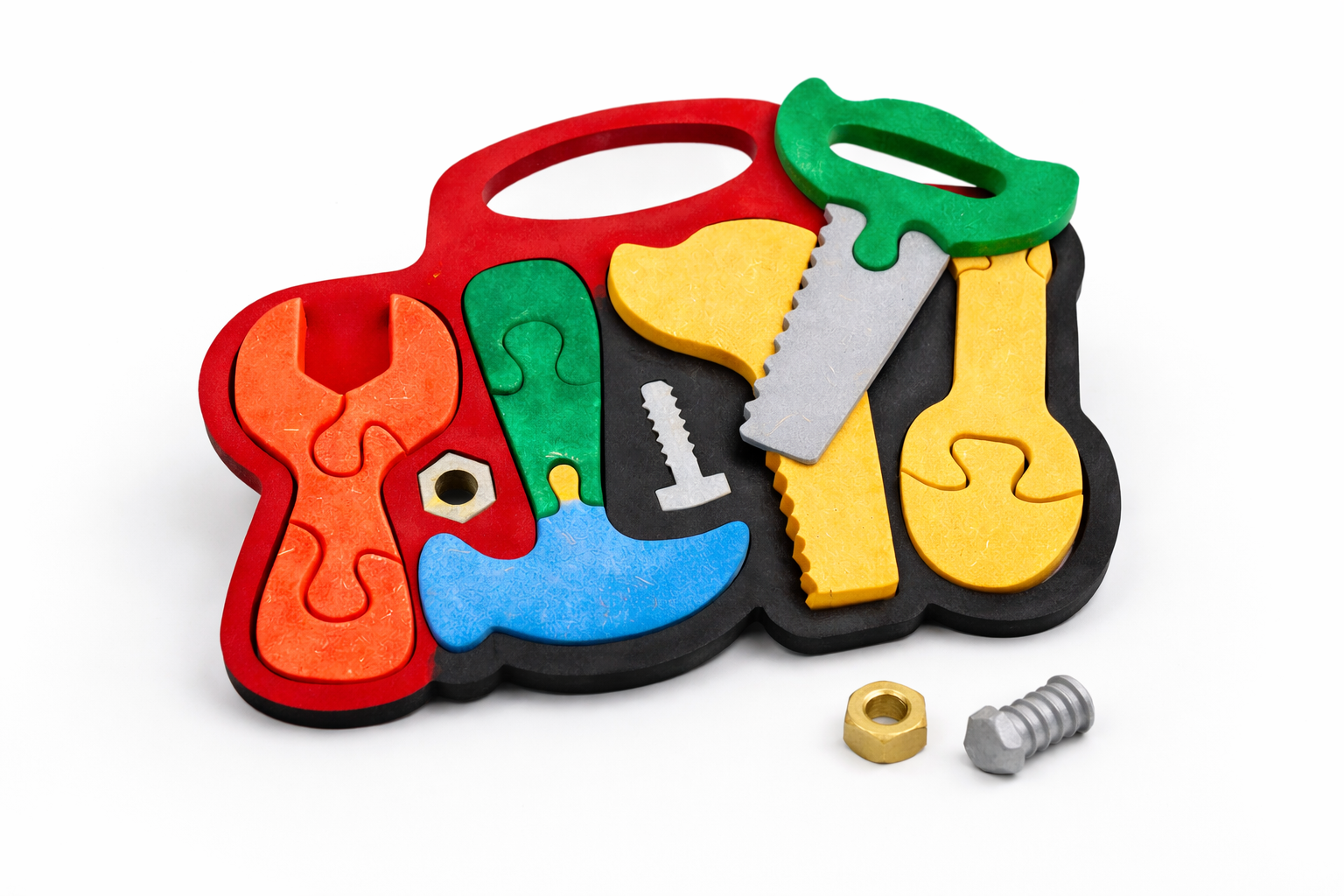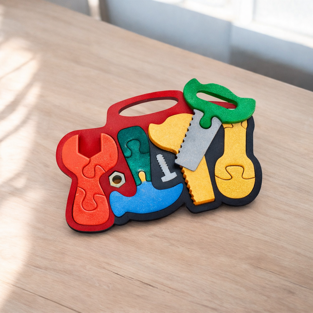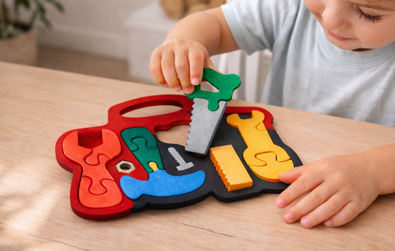 Puzzle em madeira com ferramentas ajuda a melhorar a coordenação motora, o reconhecimento de formas e a concentração, sem estímulos excessivos ou distrações.