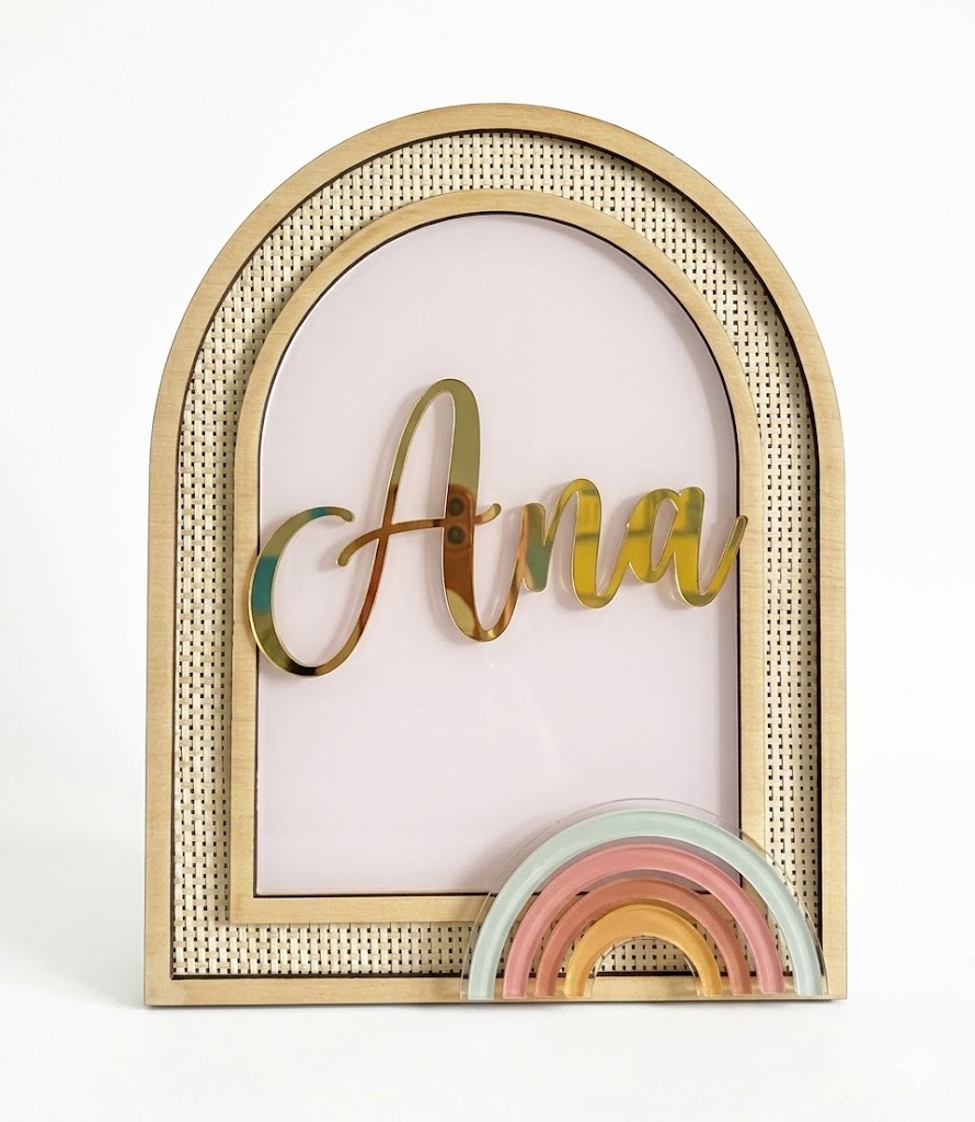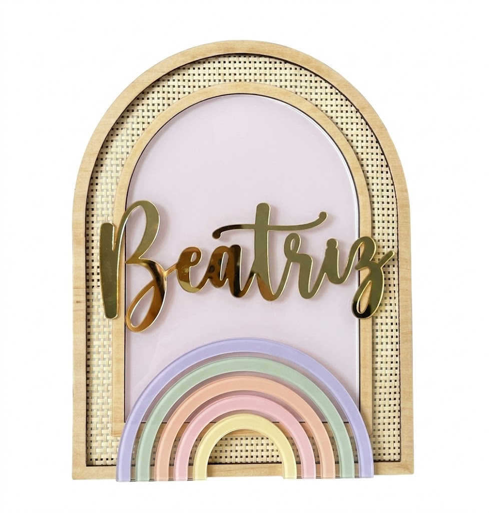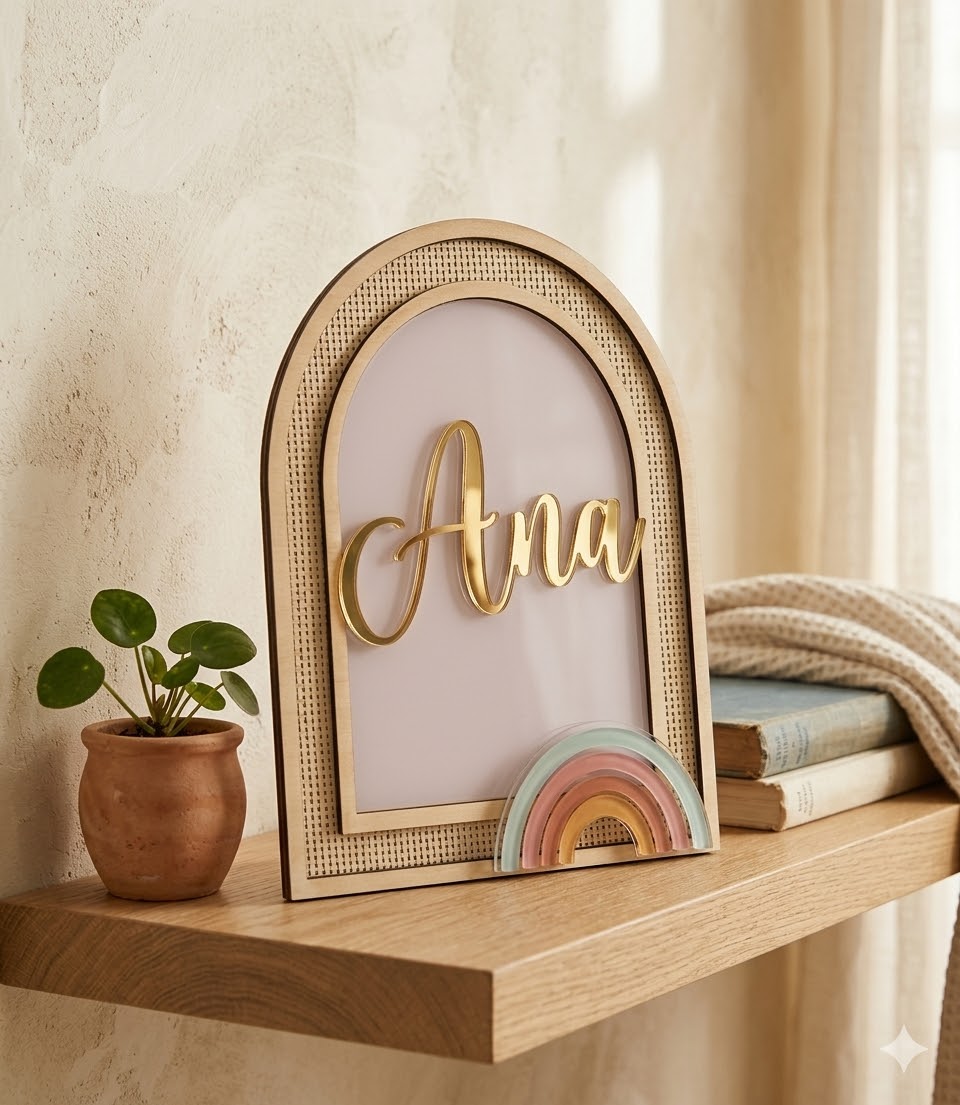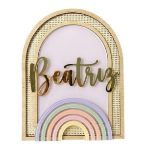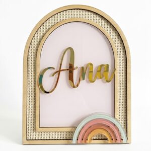 Em madeira natural com palhinha, o nome personalizado em acrílico e detalhes. Uma peça elegante e delicada, perfeita para decorar quartos de bebé ou criança, criando um ambiente acolhedor e cheio de personalidade. Ideal para oferecer em nascimentos, aniversários ou batizados. ☀️