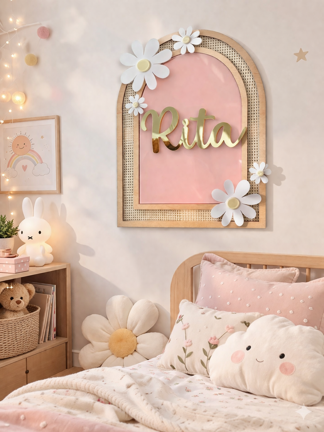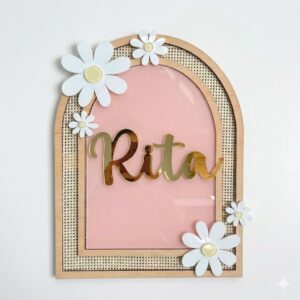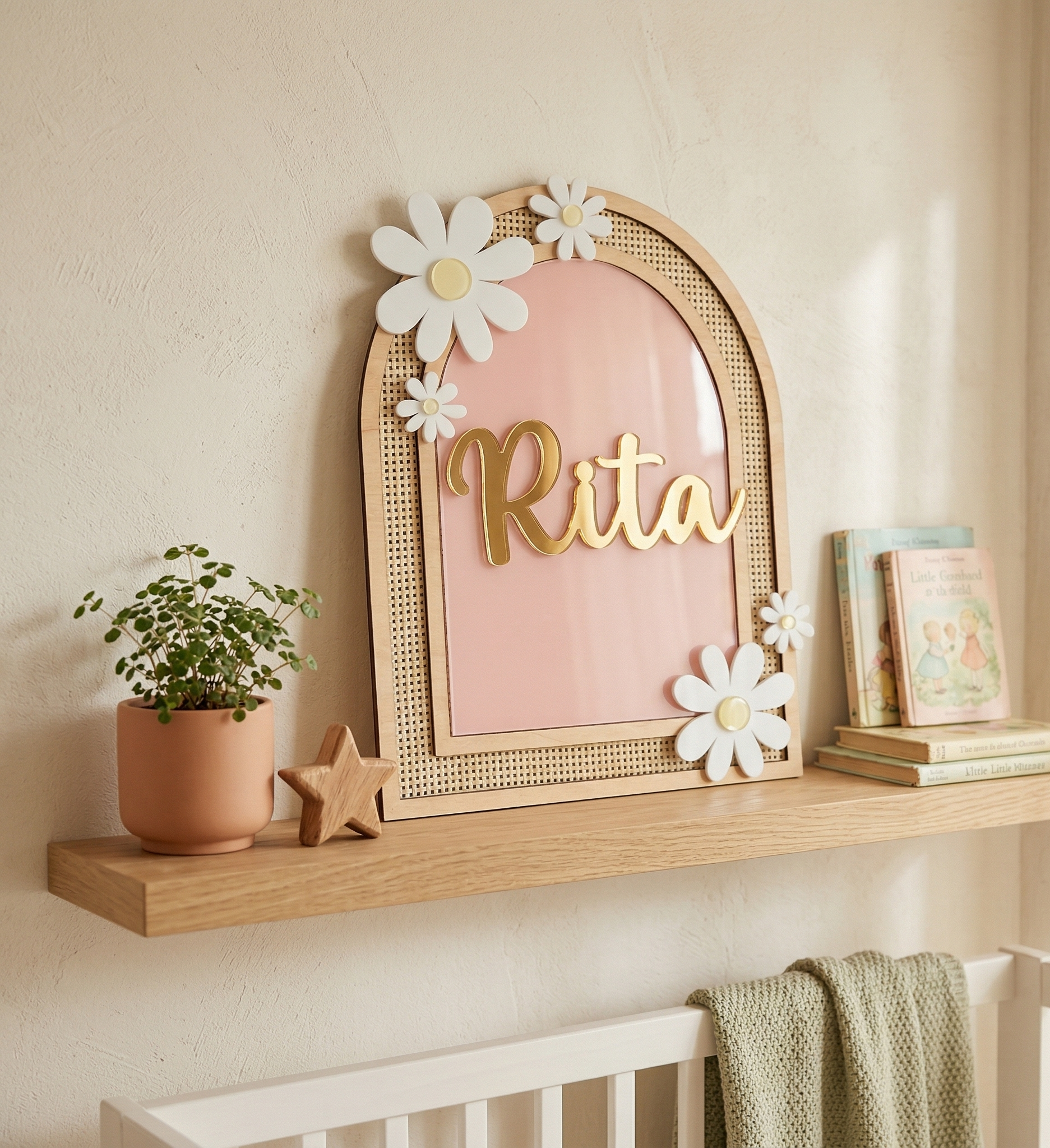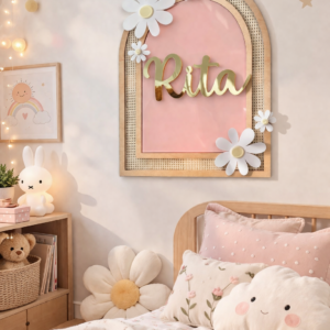 Em madeira natural com palhinha, o nome personalizado em acrílico e detalhes. Uma peça elegante e delicada, perfeita para decorar quartos de bebé ou criança, criando um ambiente acolhedor e cheio de personalidade. Ideal para oferecer em nascimentos, aniversários ou batizados. ☀️