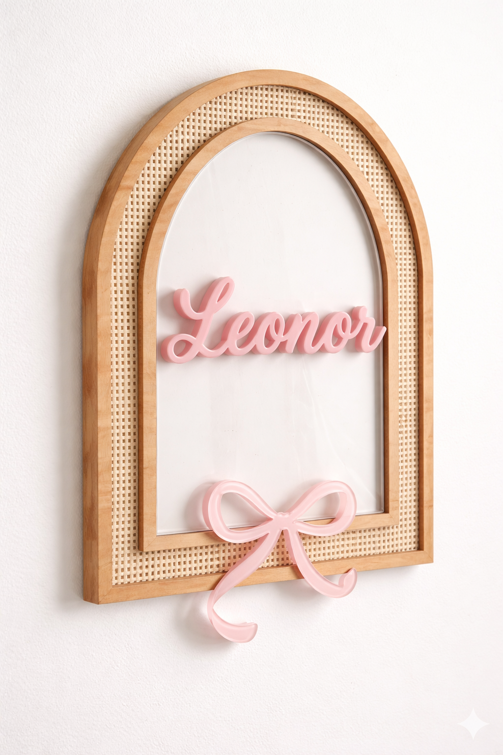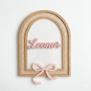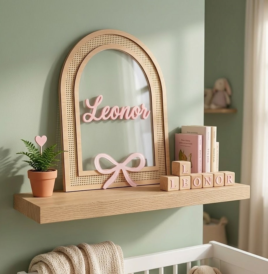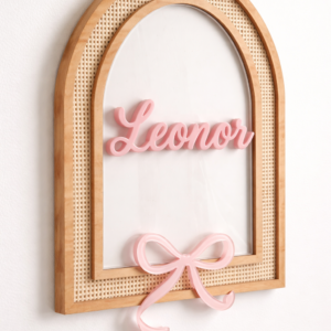 Em madeira natural com palhinha, o nome personalizado em acrílico e detalhes. Uma peça elegante e delicada, perfeita para decorar quartos de bebé ou criança, criando um ambiente acolhedor e cheio de personalidade. Ideal para oferecer em nascimentos, aniversários ou batizados. ☀️