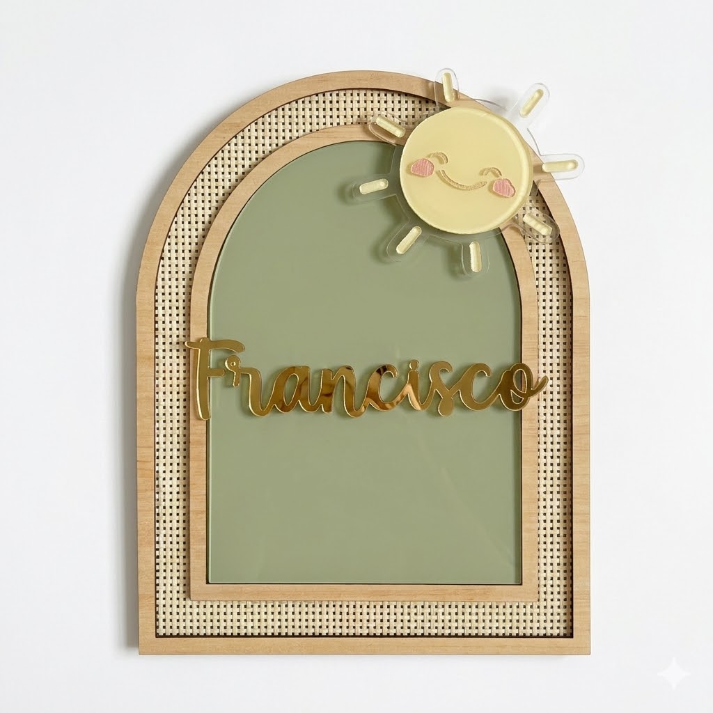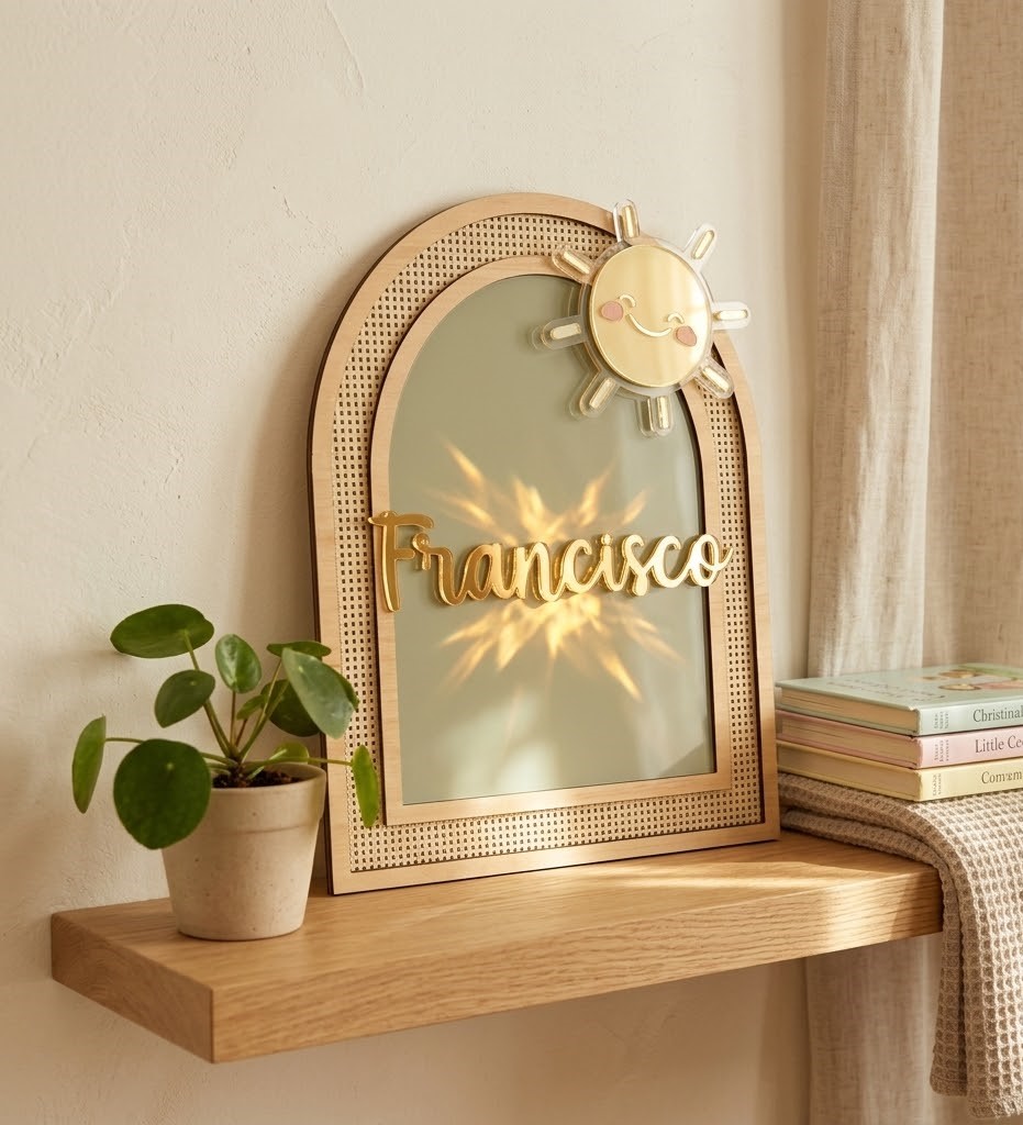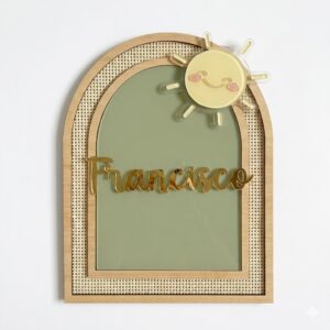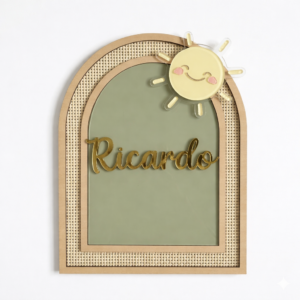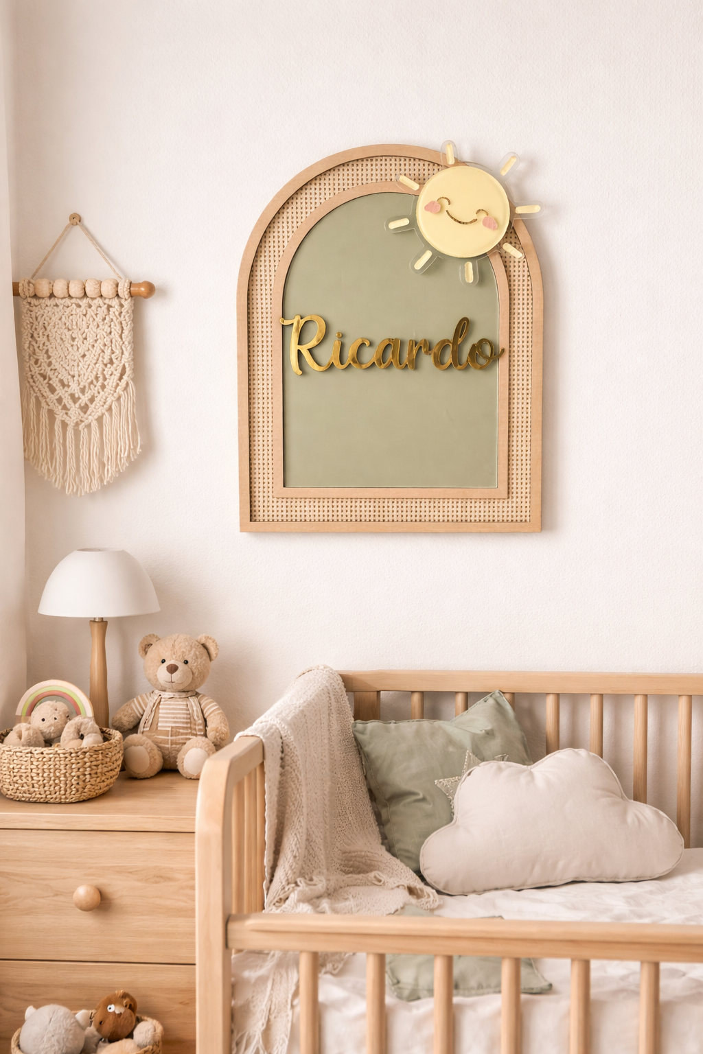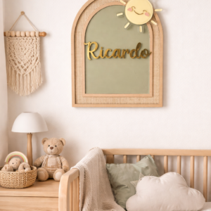 Em madeira natural com palhinha, o nome personalizado em acrílico e detalhes. Uma peça elegante e delicada, perfeita para decorar quartos de bebé ou criança, criando um ambiente acolhedor e cheio de personalidade. Ideal para oferecer em nascimentos, aniversários ou batizados. ☀️
