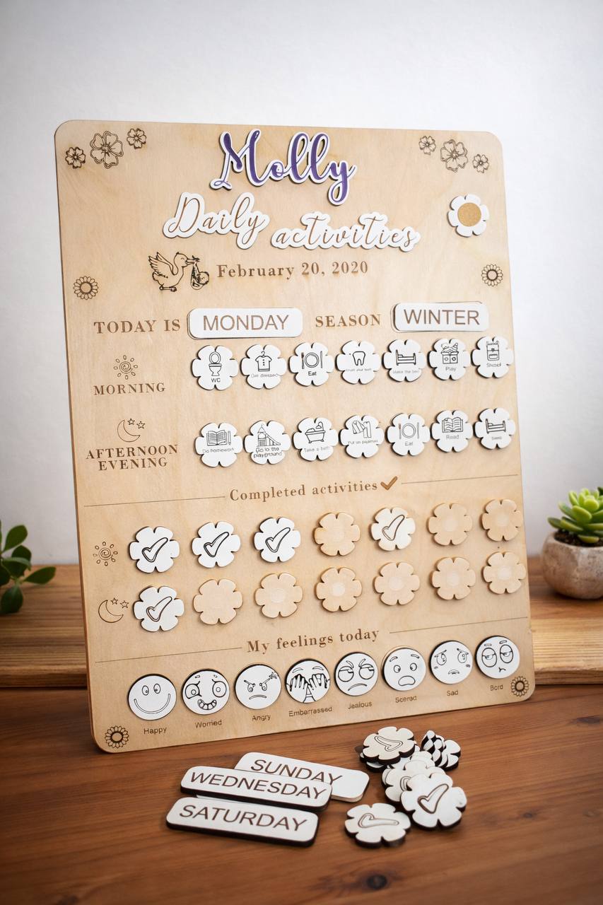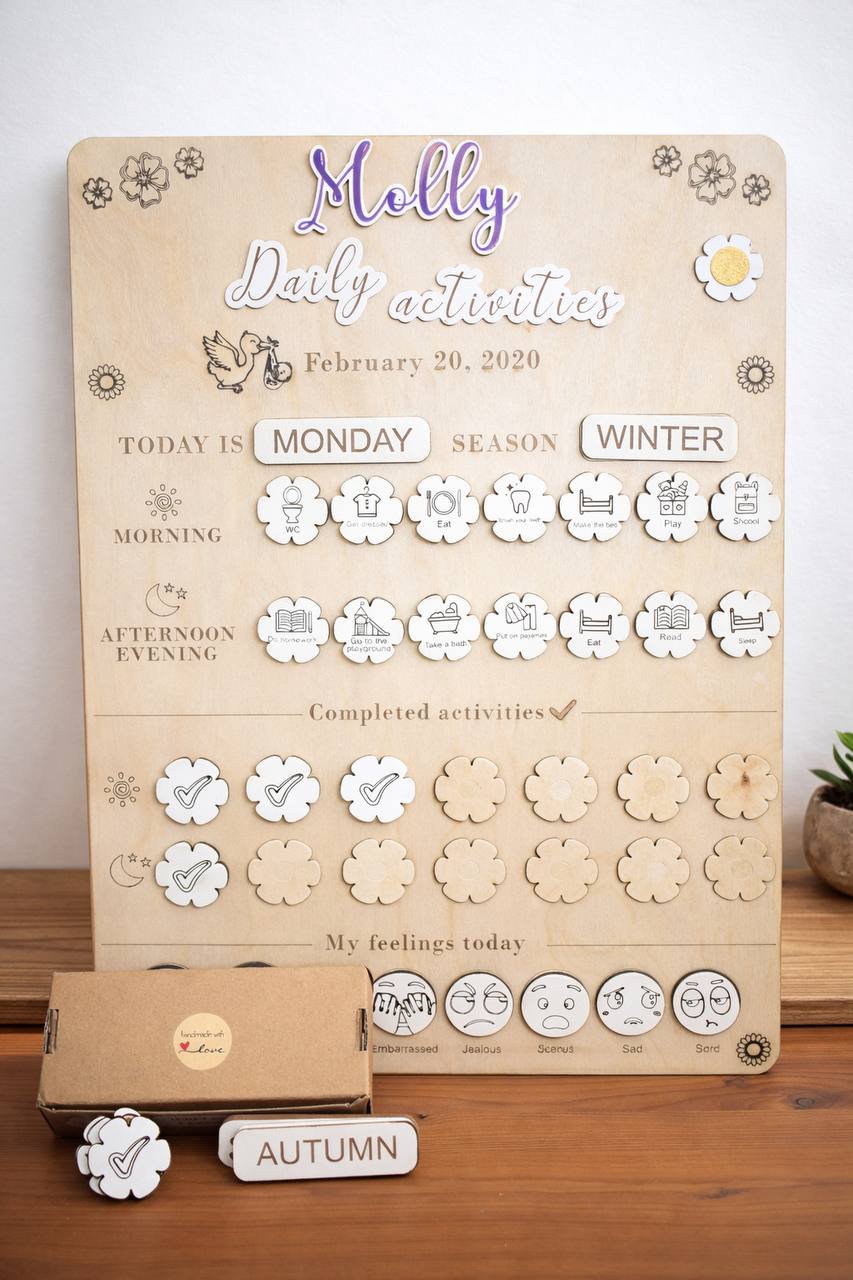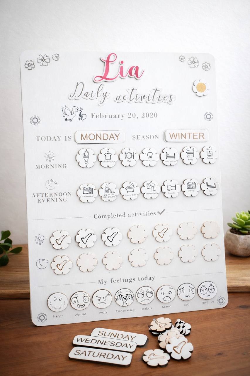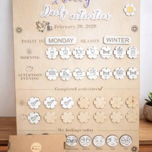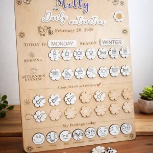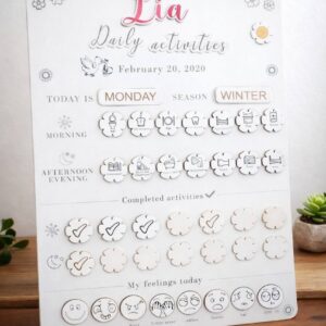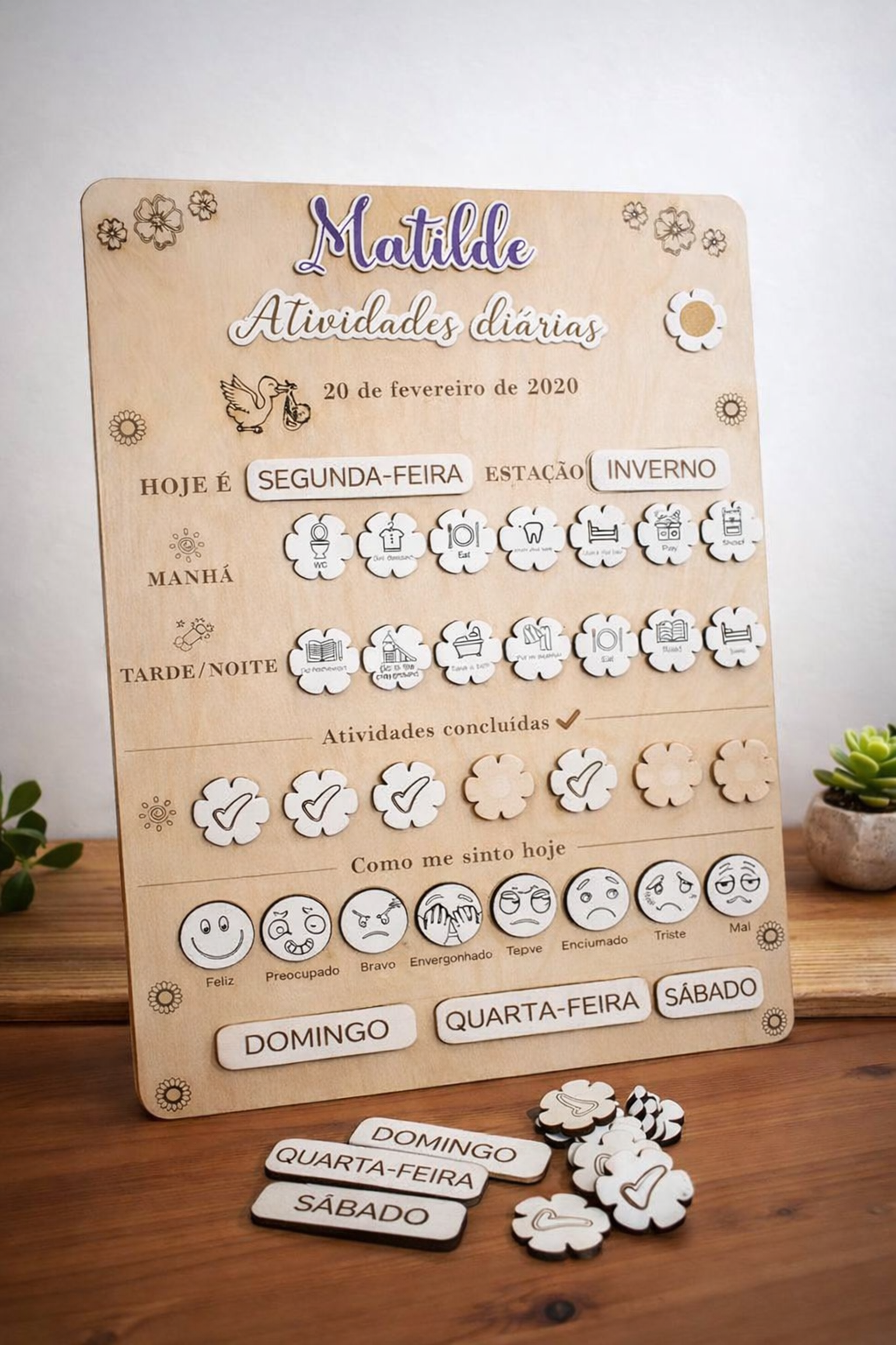 Este quadro de atividades diárias foi desenhado para incentivar as crianças a hábitos e aos sentimentos. Com um sistema visual simples e intuitivo, ajuda a criar autonomia e disciplina desde cedo.