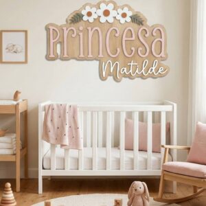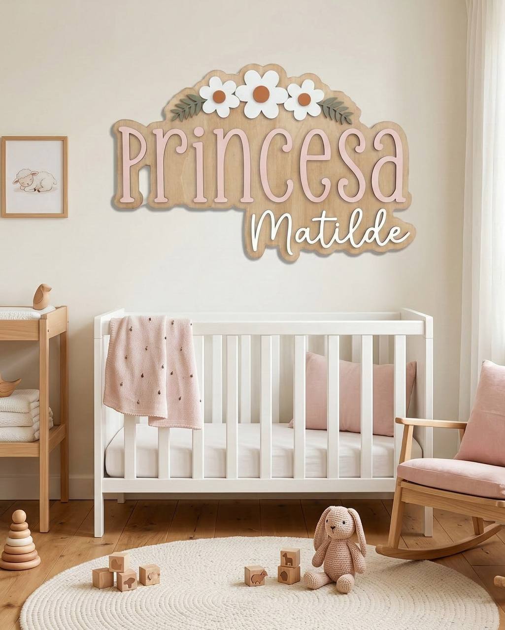 Dá personalidade ao quarto infantil com este nome personalizado em madeira bétula. A combinação da madeira natural com letras em relevo cria um efeito visual elegante e diferenciador.