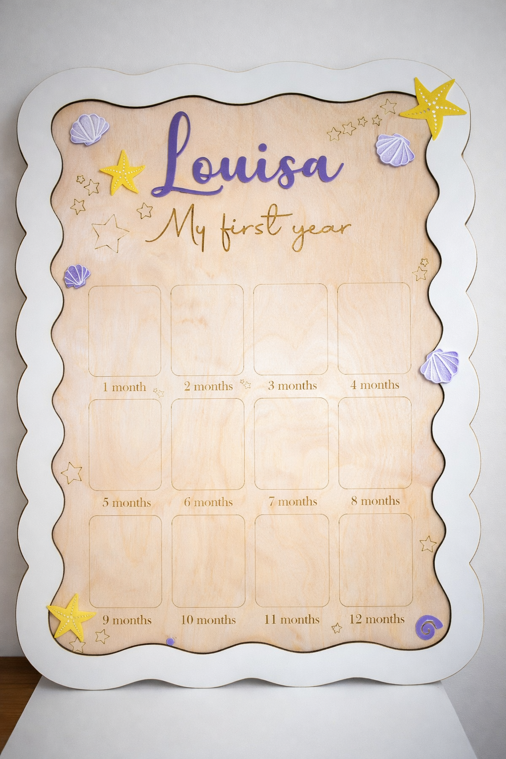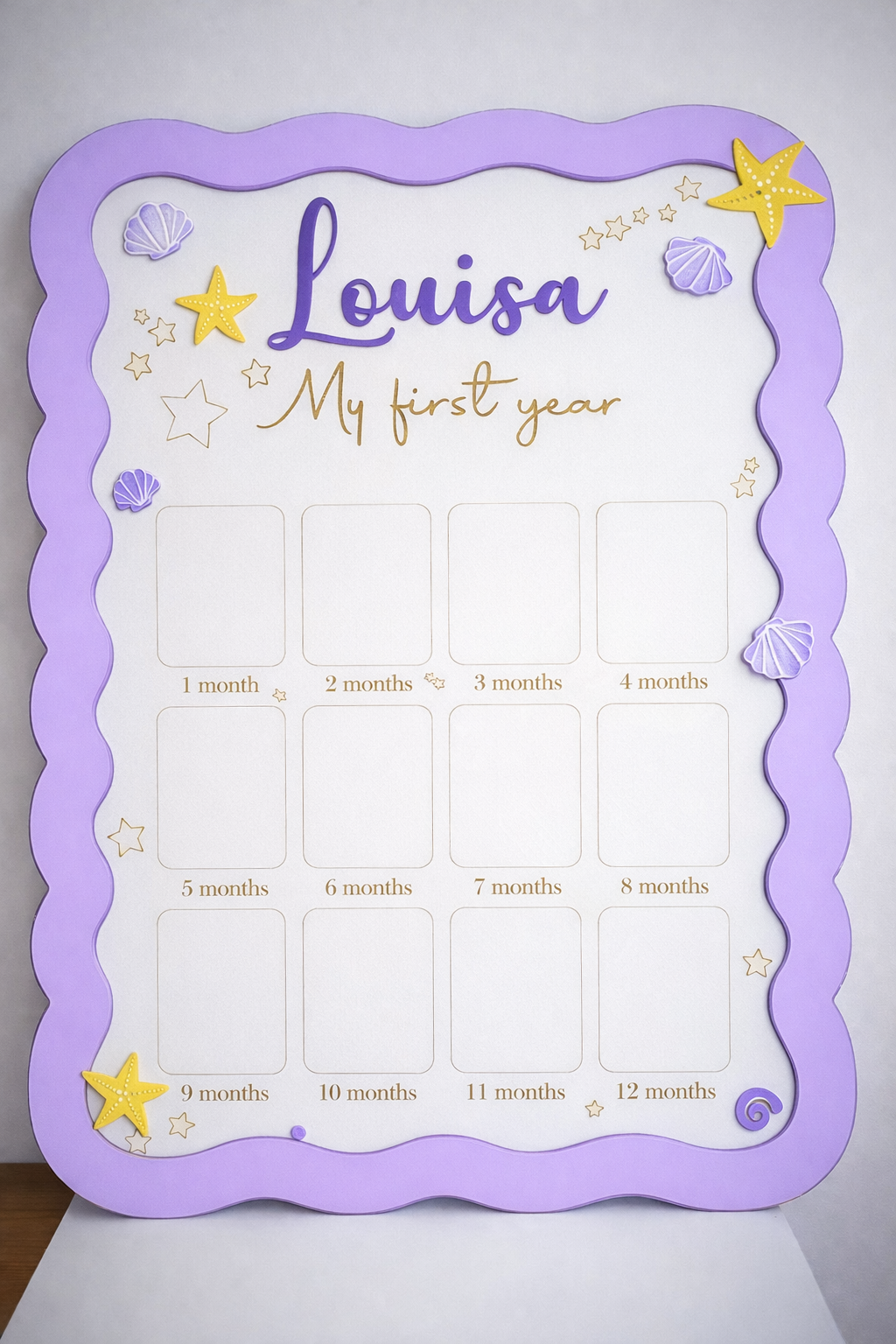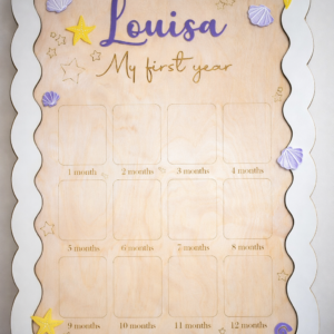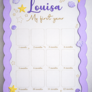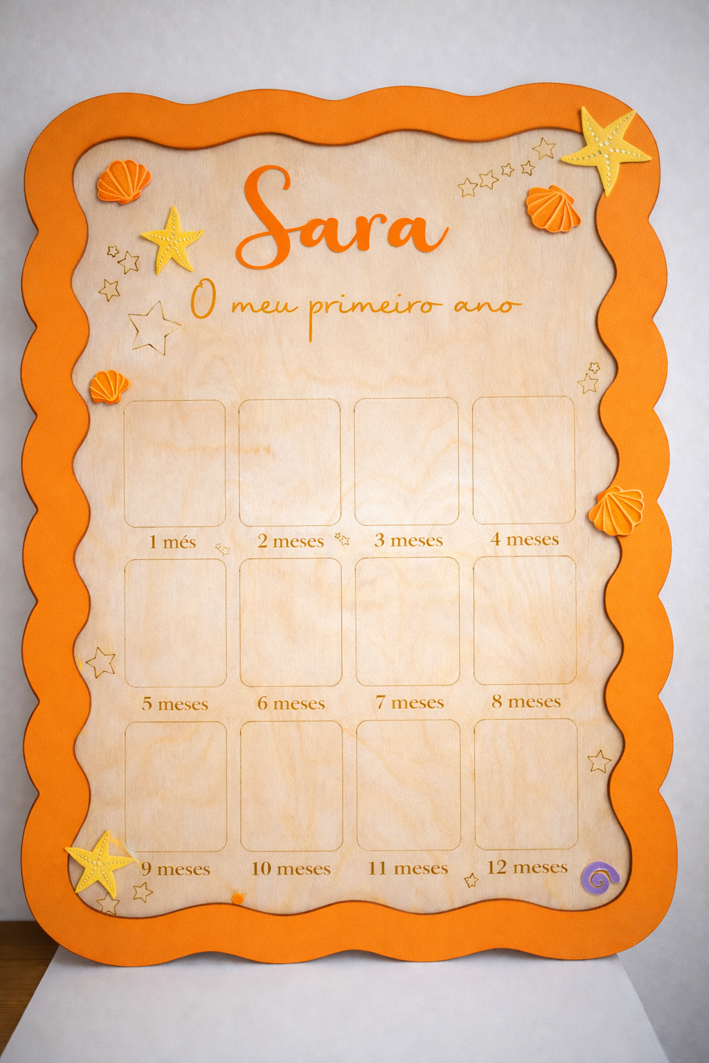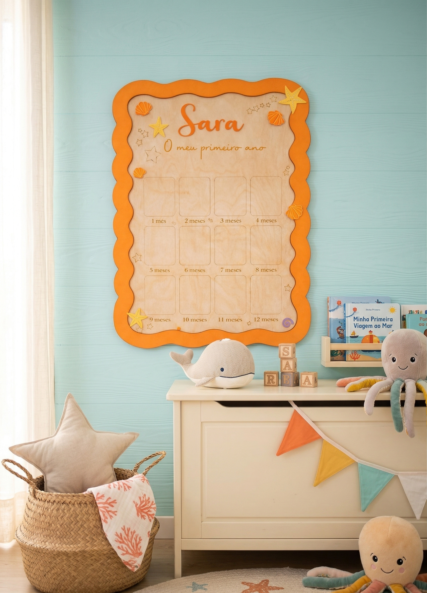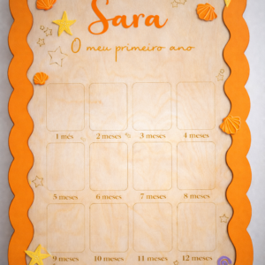 Cada espaço da placa representa um mês, permitindo acompanhar o crescimento e guardar pequenas recordações.