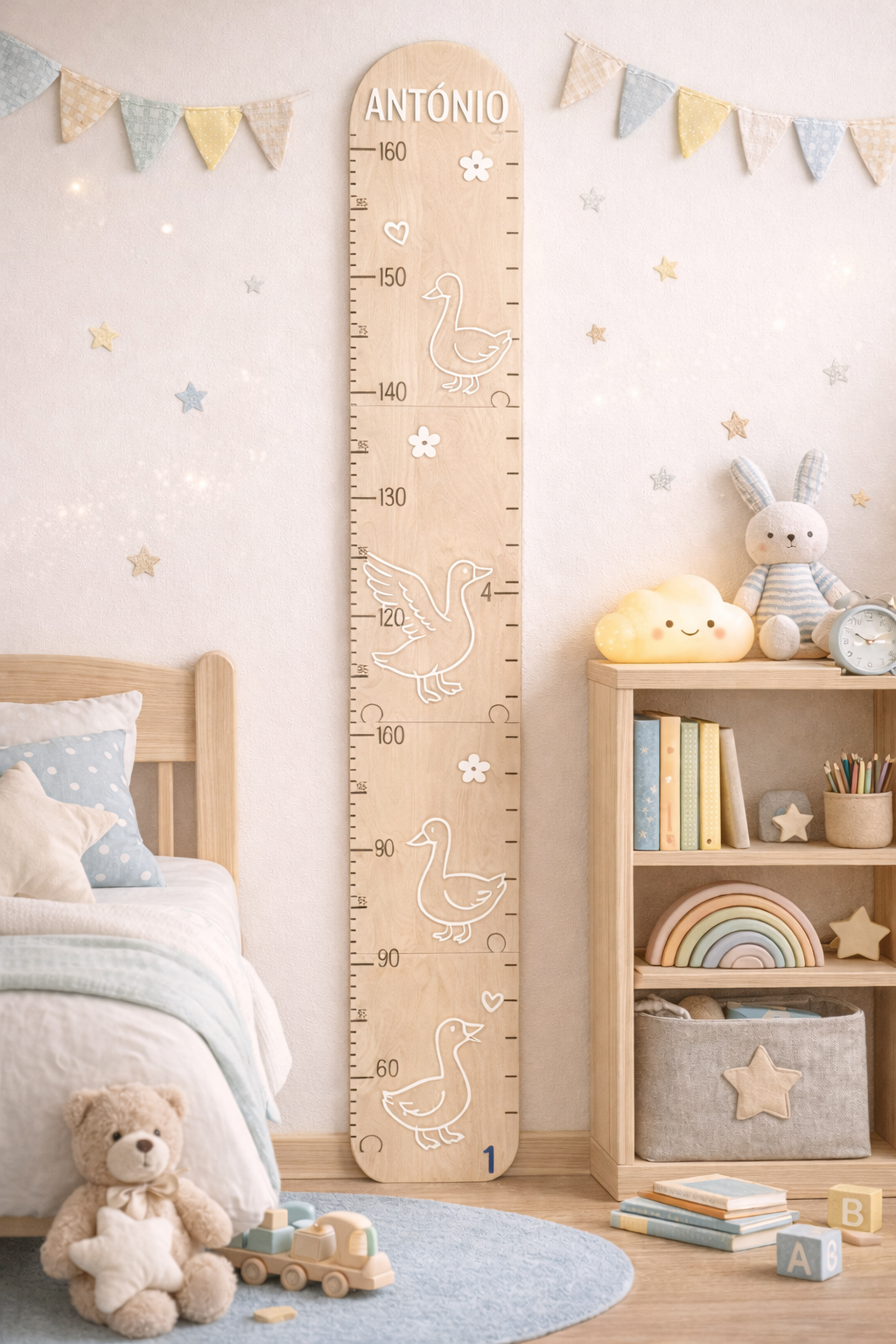 Régua de crescimento em madeira com patos em acrílico até 160cm. Personalizamos com a cor que desejar! Personalize o nome!