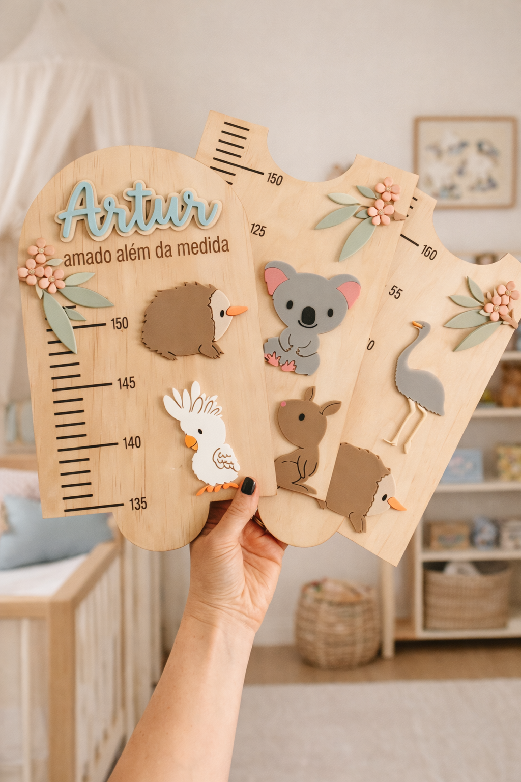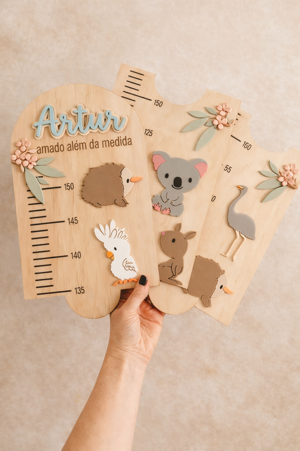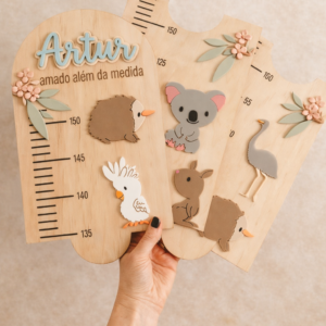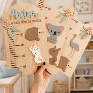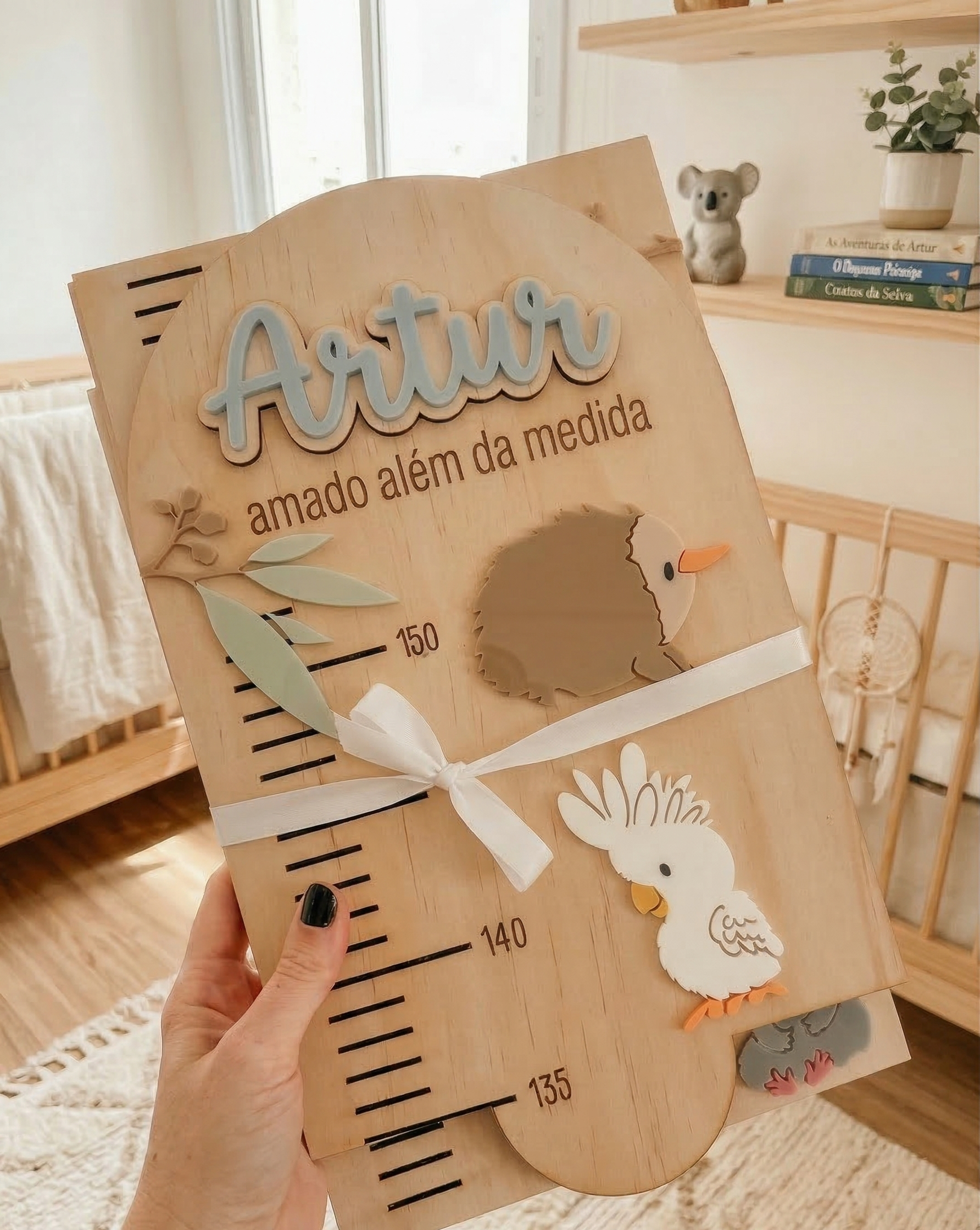 Com o nome da criança e detalhes decorativos em acrílico, é perfeita para decorar o quarto enquanto regista cada centímetro de crescimento.