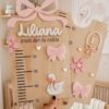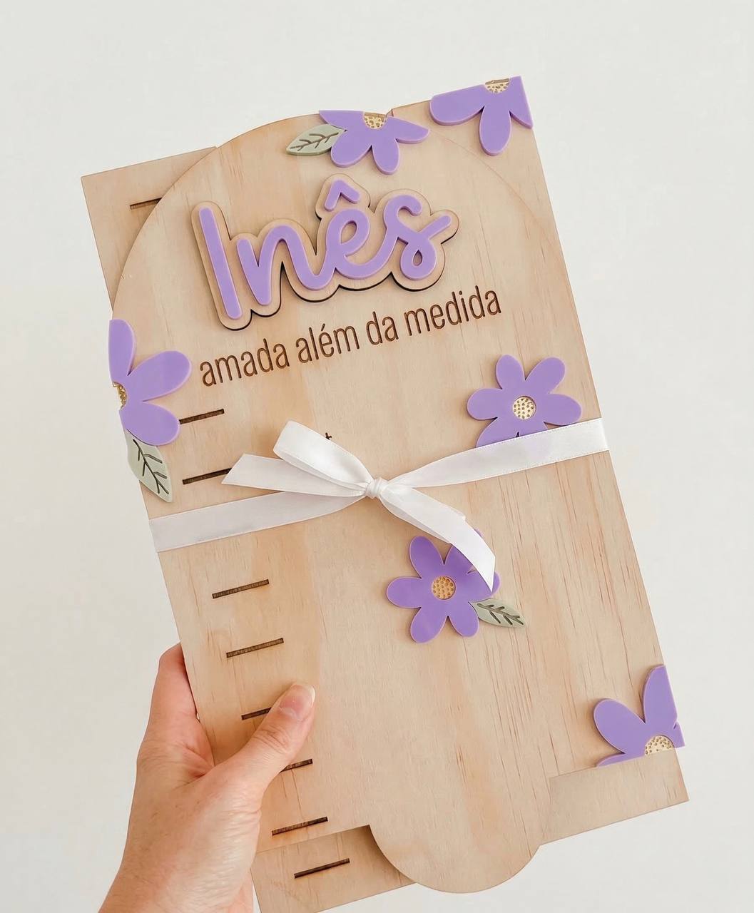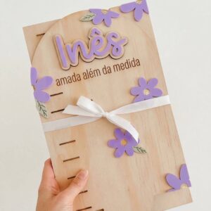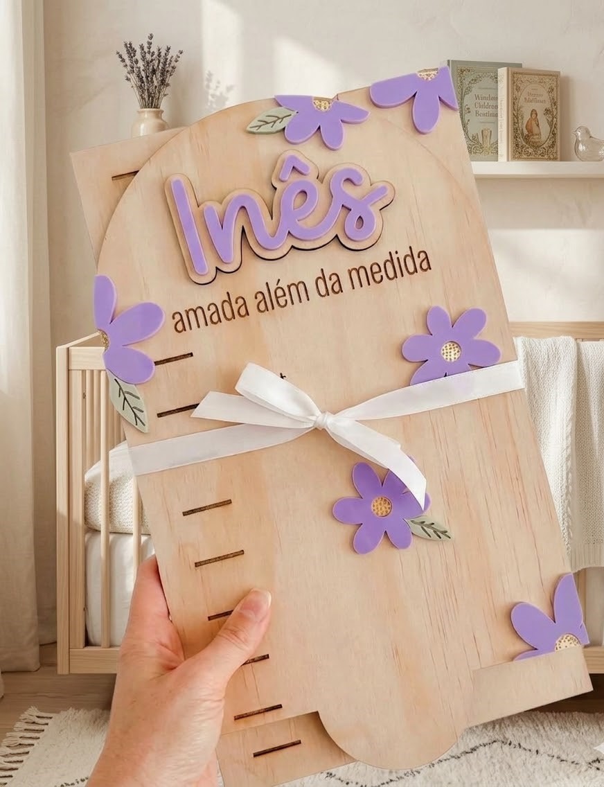 Com o nome da criança e detalhes decorativos em acrílico, é perfeita para decorar o quarto enquanto regista cada centímetro de crescimento.