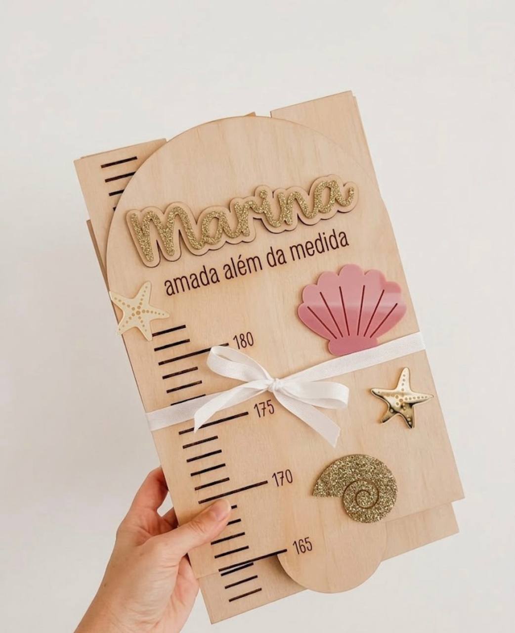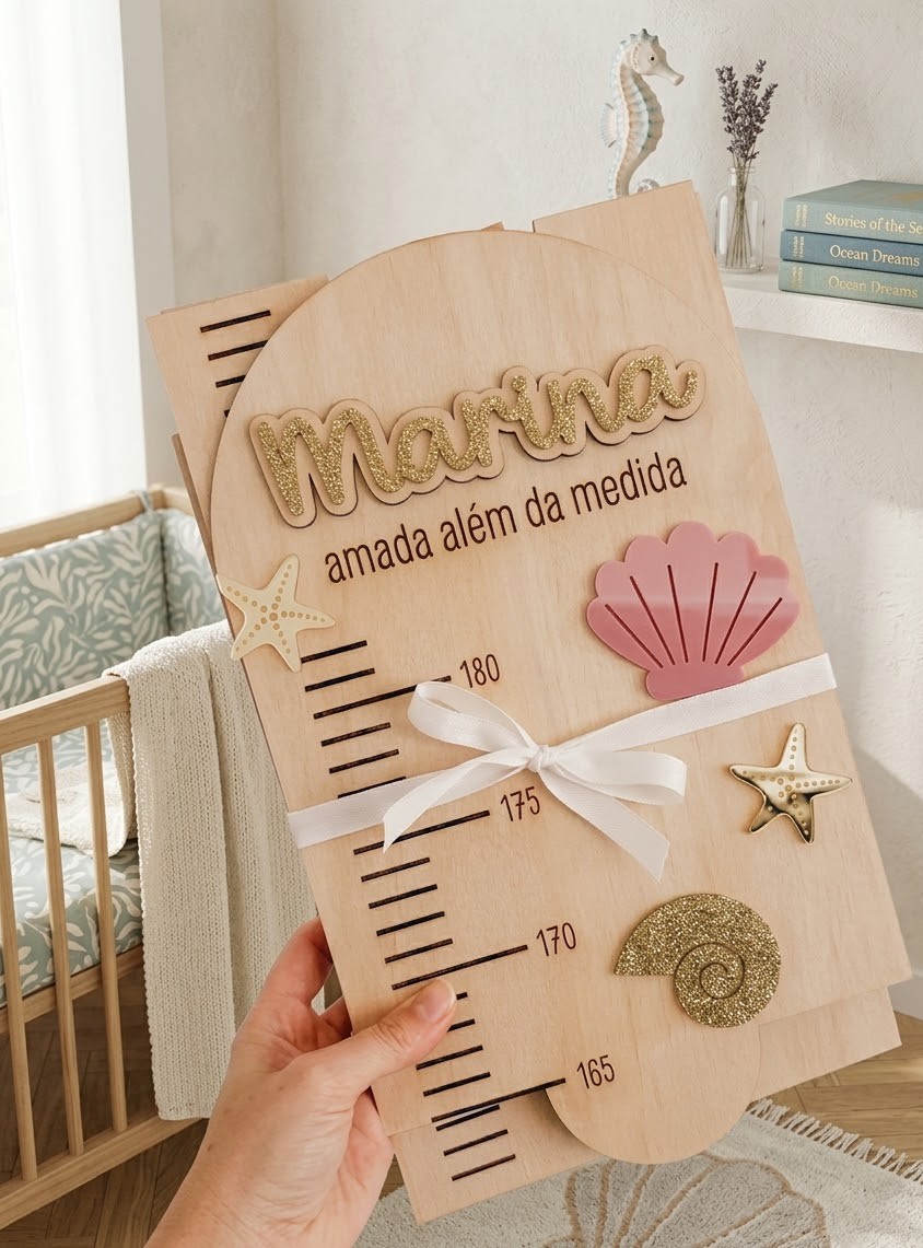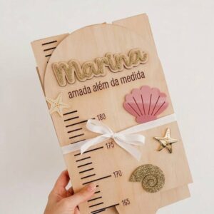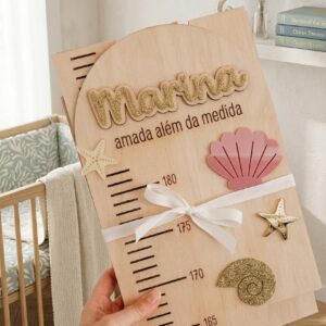 Com o nome da criança e detalhes decorativos em acrílico, é perfeita para decorar o quarto enquanto regista cada centímetro de crescimento.